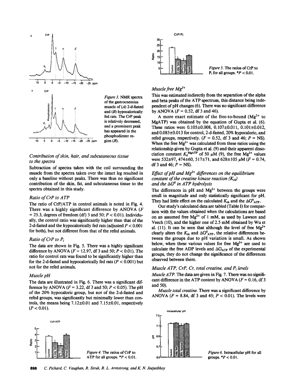 31P nuclear magnetic resonance (NMR) spectroscopy in vivo and fluorometry were used to measure muscle ATP, total creatine, pH, and Mg2+ in vivo; and to calculate creatine phosphate (CrP), the ratios of CrP/inorganic phosphate (Pi), CrP/ATP, free ADP levels, and the free-energy change in ATP hydrolysis so nutritional effects could be ascertained. These parameters were determined in vivo in resting control, 2-d-fasted, and hypocalorically fed rats and in animals similarly hypocalorically fed and then refed. The ATP, Pi, and intracellular Mg2+ levels were comparable in the four groups. When the fasted and underfed animals were compared with the control and refed animals, there were falls in the ratios of CrP/Pi and CrP/ATP, in the calculated CrP, and the free-energy change of ATP hydrolysis, but a rise in the calculated free ADP. In the hypocaloric group, intracellular pH fell significantly and a large peak was noted in the phosphodiester region. The data are consistent with the hypothesis that ATP levels are maintained at the cost of CrP, suggesting that ATP production is disturbed by aerobic and anaerobic mechanisms.