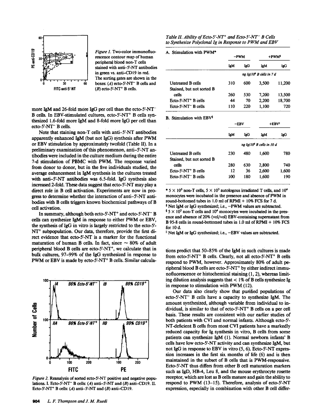 Ecto-5'-nucleotidase (ecto-5'-NT) is believed to be a maturation marker for human B lymphocytes because its expression increases during normal development and is reduced in many patients with B cell immunodeficiencies. To determine whether this enzyme defines functional subsets of B lymphocytes, human peripheral blood B cells, separated into ecto-5'-NT positive and negative populations by using goat anti-5'-NT antibodies and the fluorescence-activated cell sorter, were compared for their ability to secrete polyclonal immunoglobulin. Both populations synthesized equivalent quantities of IgM in response to a T cell-dependent (PWM) or T cell-independent (EBV) stimulator of polyclonal immunoglobulin biosynthesis. However, ecto-5'-NT+ B lymphocytes synthesized 8- to 26-fold more IgG per cell than ecto-5'-NT- B cells. These data provide the first direct evidence that ecto-5'-NT is a marker for the functional maturation of human B cells and support the hypothesis that ecto-5'-NT deficiency in patients with hypogammaglobulinemia results from a block in B lymphocyte maturation.