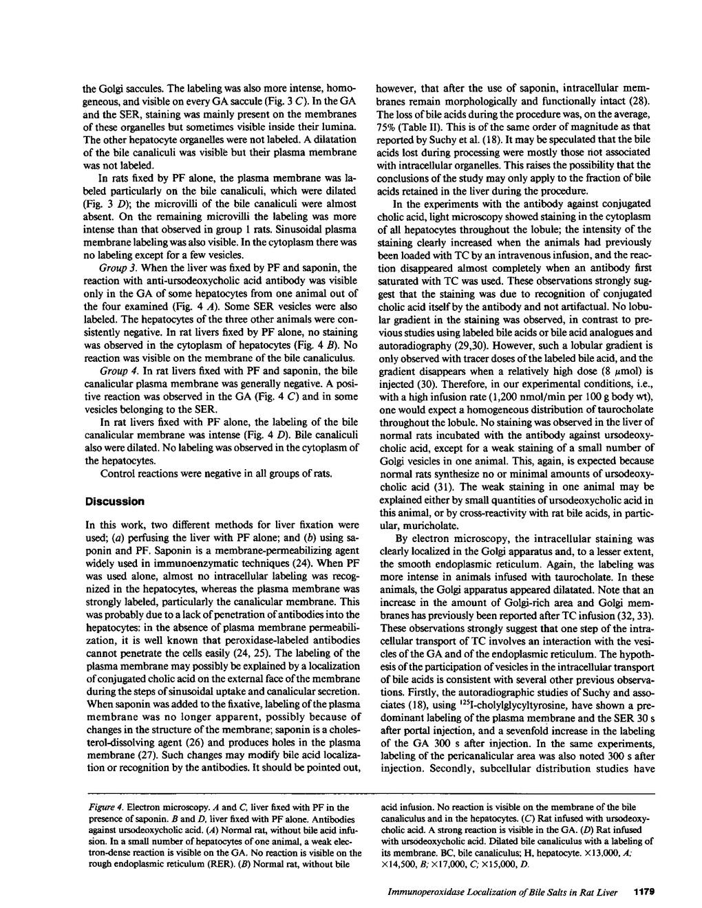 The mechanisms of intracellular transport of bile acids from the sinusoidal pole to the canalicular pole of the hepatocyte are poorly understood. There is physiological and autoradiographic evidence for a vesicular pathway. The purpose of this study was to determine the localization of natural bile acids in the liver using antibodies against cholic acid conjugates and ursodeoxycholic acid. An indirect immunoperoxidase technique was used on rat liver sections fixed either with paraformaldehyde (PF) and saponin, a membrane-permeabilizing agent that allows penetration of antibodies into the cell, or with PF alone. Retention of taurocholate in the liver after tissue processing was 26 +/- SD 15% of the bile acid initially present. When sections fixed with PF and saponin were incubated with the antibody against cholic acid conjugates, a granular cytoplasmic staining was observed by light microscopy in all hepatocytes. By electron microscopy, strong electron-dense deposits were observed mostly on vesicles of the Golgi apparatus (GA) and, sometimes, in the smooth endoplasmic reticulum (SER). After taurocholate infusion, the intensity of the reaction increased. When the liver was fixed with PF alone, almost no reaction was visible on light microscopy, but on electron microscopy the label was localized on the hepatocyte plasma membrane, mainly on the bile canalicular domain and to a lesser extent on the sinusoidal domain. With the antibody against ursodeoxycholic acid, no staining was observed in three of four livers, and a slight staining was observed in one. However, after infusion of ursodeoxycholic acid, staining of GA and SER vesicles was observed when the liver was fixed with PF and saponin. With PF alone, the reaction was intense on the canalicular membrane. These results support the view that, within the limits of the method, vesicles from the GA and possibly vesicles of the SER are involved in the intracellular transport of bile acids before canalicular secretion.