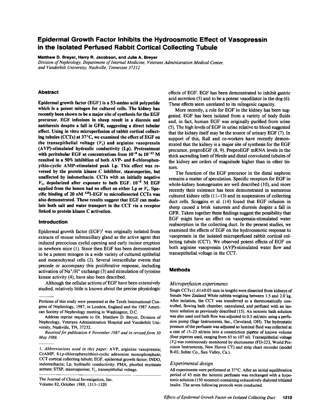 Epidermal growth factor (EGF) is a 53-amino acid polypeptide which is a potent mitogen for cultured cells. The kidney has recently been shown to be a major site of synthesis for the EGF precursor. EGF infusions in sheep result in a diuresis and natriuresis despite a fall in GFR, suggesting a direct tubular effect. Using in vitro microperfusion of rabbit cortical collecting tubules (CCTs) at 37 degrees C, we examined the effect of EGF on the transepithelial voltage (Vt) and arginine vasopressin (AVP)-stimulated hydraulic conductivity (Lp). Pretreatment with peritubular EGF at concentrations from 10(-8) to 10(-12) M resulted in a 50% inhibition of both AVP- and 8-chlorophenythio-cyclic AMP-stimulated peak Lp. This effect was reversed by the protein kinase C inhibitor, staurosporine, but unaffected by indomethacin. CCTs with an initially negative Vt, depolarized after exposure to bath EGF. 10(-8) M EGF applied from the lumen had no effect on either Lp or Vt. Specific binding of 20 nM 125I-EGF to microdissected CCTs was also demonstrated. These results suggest that EGF can modulate both salt and water transport in the CCT via a receptor linked to protein kinase C activation.