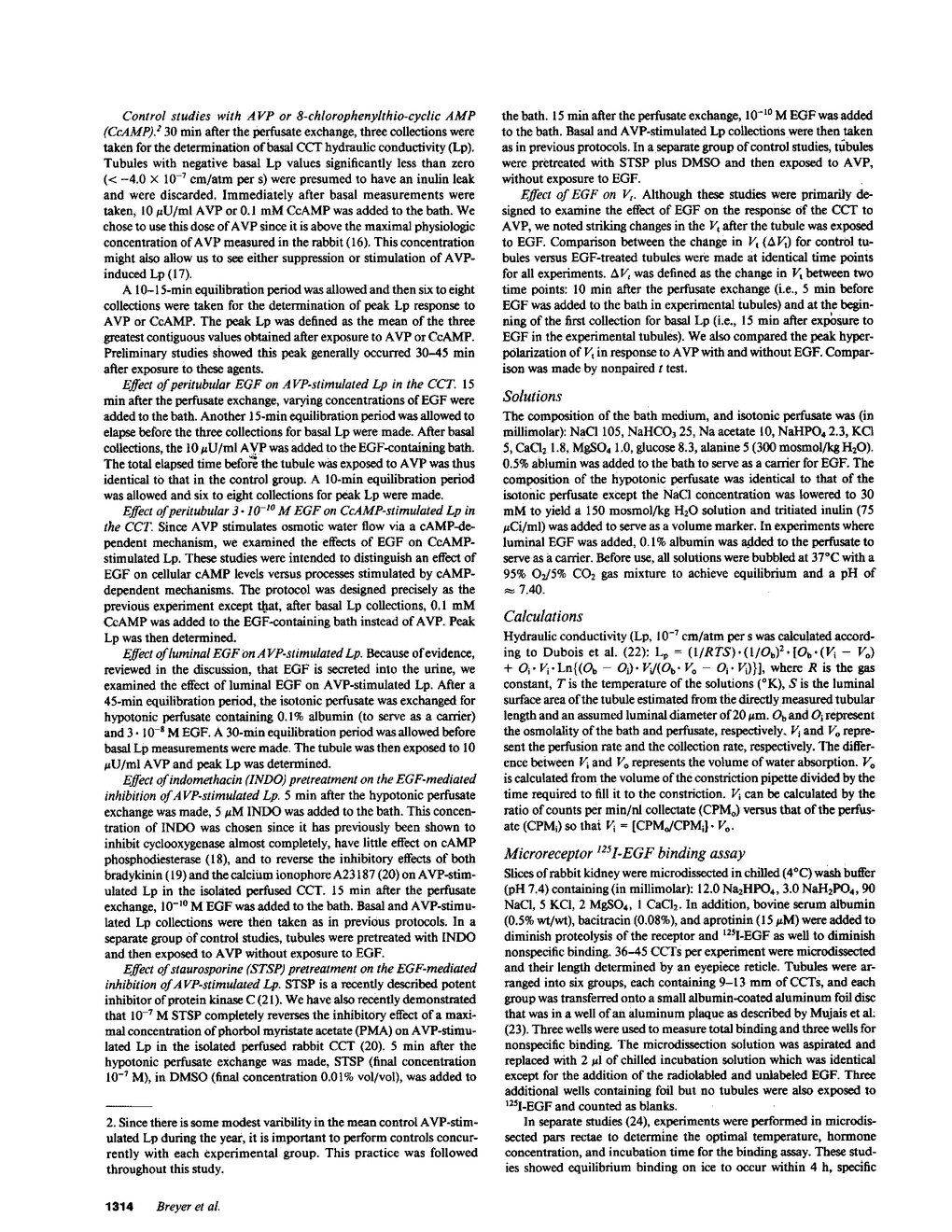 Epidermal growth factor (EGF) is a 53-amino acid polypeptide which is a potent mitogen for cultured cells. The kidney has recently been shown to be a major site of synthesis for the EGF precursor. EGF infusions in sheep result in a diuresis and natriuresis despite a fall in GFR, suggesting a direct tubular effect. Using in vitro microperfusion of rabbit cortical collecting tubules (CCTs) at 37 degrees C, we examined the effect of EGF on the transepithelial voltage (Vt) and arginine vasopressin (AVP)-stimulated hydraulic conductivity (Lp). Pretreatment with peritubular EGF at concentrations from 10(-8) to 10(-12) M resulted in a 50% inhibition of both AVP- and 8-chlorophenythio-cyclic AMP-stimulated peak Lp. This effect was reversed by the protein kinase C inhibitor, staurosporine, but unaffected by indomethacin. CCTs with an initially negative Vt, depolarized after exposure to bath EGF. 10(-8) M EGF applied from the lumen had no effect on either Lp or Vt. Specific binding of 20 nM 125I-EGF to microdissected CCTs was also demonstrated. These results suggest that EGF can modulate both salt and water transport in the CCT via a receptor linked to protein kinase C activation.