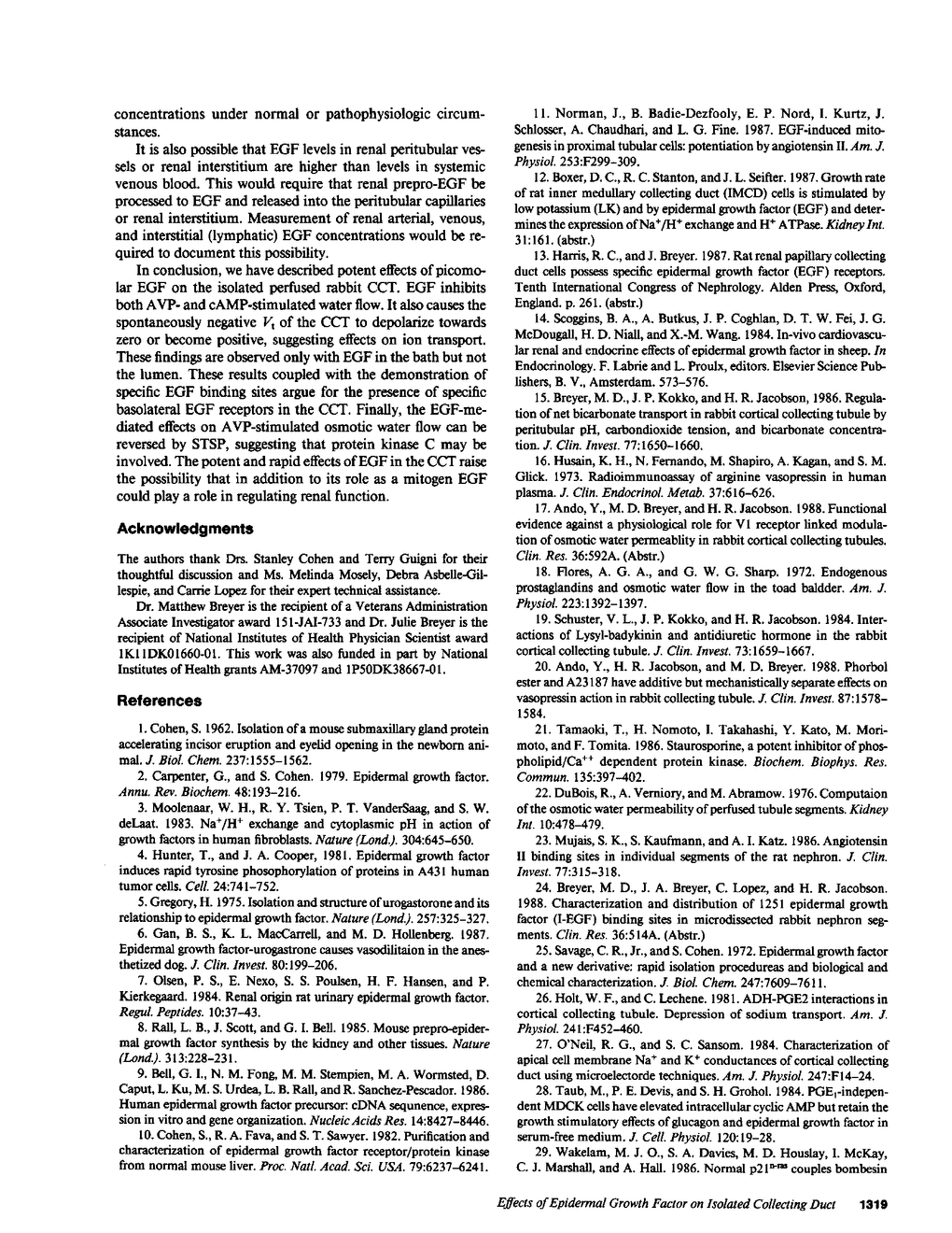 Epidermal growth factor (EGF) is a 53-amino acid polypeptide which is a potent mitogen for cultured cells. The kidney has recently been shown to be a major site of synthesis for the EGF precursor. EGF infusions in sheep result in a diuresis and natriuresis despite a fall in GFR, suggesting a direct tubular effect. Using in vitro microperfusion of rabbit cortical collecting tubules (CCTs) at 37 degrees C, we examined the effect of EGF on the transepithelial voltage (Vt) and arginine vasopressin (AVP)-stimulated hydraulic conductivity (Lp). Pretreatment with peritubular EGF at concentrations from 10(-8) to 10(-12) M resulted in a 50% inhibition of both AVP- and 8-chlorophenythio-cyclic AMP-stimulated peak Lp. This effect was reversed by the protein kinase C inhibitor, staurosporine, but unaffected by indomethacin. CCTs with an initially negative Vt, depolarized after exposure to bath EGF. 10(-8) M EGF applied from the lumen had no effect on either Lp or Vt. Specific binding of 20 nM 125I-EGF to microdissected CCTs was also demonstrated. These results suggest that EGF can modulate both salt and water transport in the CCT via a receptor linked to protein kinase C activation.