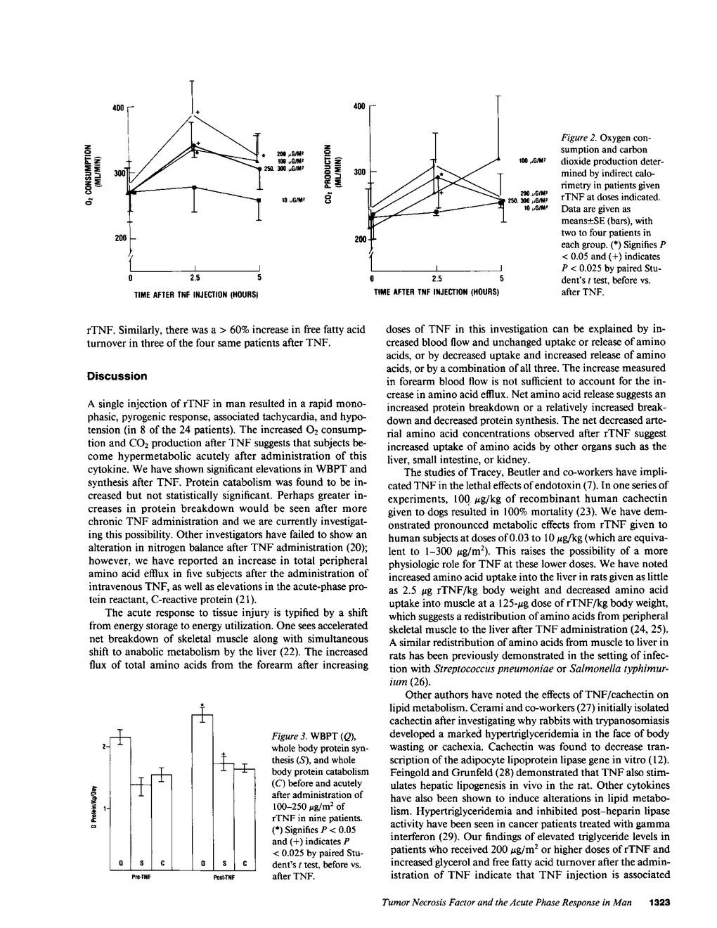 Tumor necrosis factor (cachectin), a protein produced by monocytes and macrophages, has been implicated as an important mediator of the lethal effects of endotoxic shock and the cachexia of chronic infection. Recombinant human tumor necrosis factor alpha (rTNF) was given intravenously to patients as part of an antineoplastic trial. Fever, tachycardia, and at higher doses, hypotension occurred after a single injection of rTNF. Metabolic effects after rTNF administration were dose related and included enhanced energy expenditure with elevated CO2 production, increased whole body protein metabolism and peripheral amino acid efflux from the forearm, and decreased total arterial amino acid levels associated with a significant increase in plasma cortisol. Elevated serum triglycerides, as well as increased glycerol and free fatty acid turnover were seen, suggesting increased whole body lipolysis and fat utilization after rTNF. These findings indicate that administration of TNF in man reproduces many of the acute physiologic and metabolic responses to tissue injury, including energy substrate mobilization.
