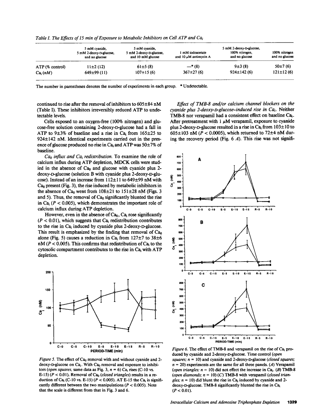 An elevation in cytosolic free calcium (Cai) produced by cellular ATP depletion may contribute to the initiation of cytotoxic events in renal ischemia. To evaluate whether ATP depletion results in a rise in Cai we examined the effect of cyanide and 2-deoxy-D-glucose on the Cai of Madin-Darby canine kidney cells. Exposure to the metabolic inhibitors resulted in a rise in Cai from 112 +/- 11 to 649 +/- 99 nM in 15 min. This combination of metabolic inhibitors also resulted in a decrement of cell ATP to 11 +/- 2% of control by 15 min. Experiments that were performed with other metabolic inhibitors confirm that the increment in Cai is due to inhibition of ATP synthesis. With the removal of cyanide and 2-deoxy-D-glucose, Cai recovered to 101 +/- 16 nM. In the absence of extracellular calcium activity (Ca0), Cai declined from 127 +/- 7 to 38 +/- 6 nM, whereas with cyanide plus 2-deoxy-D-glucose in the absence of Ca0 the Cai rose from 108 +/- 21 to 151 +/- 28 nM. Because the rise in Cai produced by ATP depletion in the absence of Ca0 is significantly less than that which occurs in the presence of Ca0, influx of Ca0 is necessary for the maximal rise of Cai. The rise in Cai that occurred in the absence of Ca0 suggests that the release of calcium from intracellular stores contributes to the increment in Cai seen with ATP depletion. TMB-8, an inhibitor of calcium release from intracellular stores, blunted the rise in Cai by nearly 50%. Neither verapamil nor nifedipine inhibited the rise in Cai. This study demonstrates that ATP depletion induced by the metabolic inhibitors cyanide and 2-deoxy-D-glucose is associated with a rapid and reversible increase in Cai. Both Ca0 influx and Cai redistribution contribute to this rise.