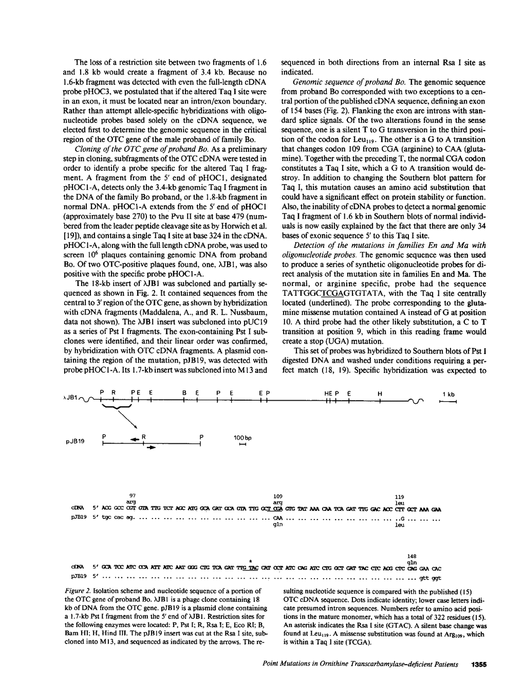 Point mutations in the X-linked ornithine transcarbamylase (OTC) gene have been detected at the same Taq I restriction site in 3 of 24 unrelated probands with OTC deficiency. A de novo mutation could be traced in all three families to an individual in a prior generation, confirming independent recurrence. The DNA sequence in the region of the altered Taq I site was determined in the three probands. In two unrelated male probands with neonatal onset of severe OTC deficiency, a guanine (G) to adenine (A) mutation on the sense strand (antisense cytosine [C] to thymine [T]) was found, resulting in glutamine for arginine at amino acid 109 of the mature polypeptide. In the third case, where the proband was a symptomatic female, C to T (sense strand) transition converted residue 109 to a premature stop. These results support the observation that Taq I restriction sites, which contain an internal CG, are particularly susceptible to C to T transition mutation due to deamination of a methylated C in either the sense or antisense strand. The OTC gene seems especially sensitive to C to T transition mutation at arginine codon 109 because either a nonsense mutation or an extremely deleterious missense mutation will result.