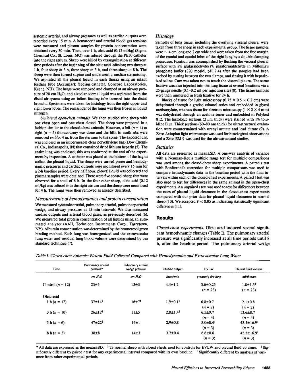 We studied anesthetized sheep to determine the relationship between increased permeability pulmonary edema and the development and mechanism of pleural effusion formation. In 12 sheep with intact, closed thoraces, we studied the time course of pleural liquid formation after 0.12 ml/kg i.v. oleic acid. After 1 h, there were no pleural effusions, even though extravascular lung water increased 50% to 6.0 +/- 0.7 g/g dry lung. By 3 h pleural effusions had formed, they reached a maximum at 5 h (48.5 +/- 16.9 ml/thorax), and at 8 h there was no additional accumulation of pleural liquid (45.5 +/- 16.9 ml). Morphologic studies by light and electron microscopy demonstrated subpleural edema but no detectable injury to the visceral pleura, suggesting that the pleural liquid originated from the lung and not the pleura. In nine sheep, we quantified the rate of formation of pleural liquid by enclosing one lung in a plastic bag. By comparing in the same sheep the volume of pleural liquid collected from the enclosed lung to the volume found in the opposite intact chest, we estimated the rate of liquid absorption from the intact chest to be 0.32 ml/(kg.h); we had previously reported a liquid absorption rate of 0.28 ml/(kg.h) in normal sheep. These studies also supported the conclusion that the majority of the pleural liquid originated from the lung because we could account for all of the pleural liquid that was formed and cleared. The volume of pleural liquid collected from the enclosed lungs was equal to 21% of the excess lung liquid that formed after oleic acid-induced lung injury. Thus, the pleural space and parietal pleural lymphatic pathways are important pathways for the clearance of pulmonary edema liquid after experimentally induced increased permeability pulmonary edema.