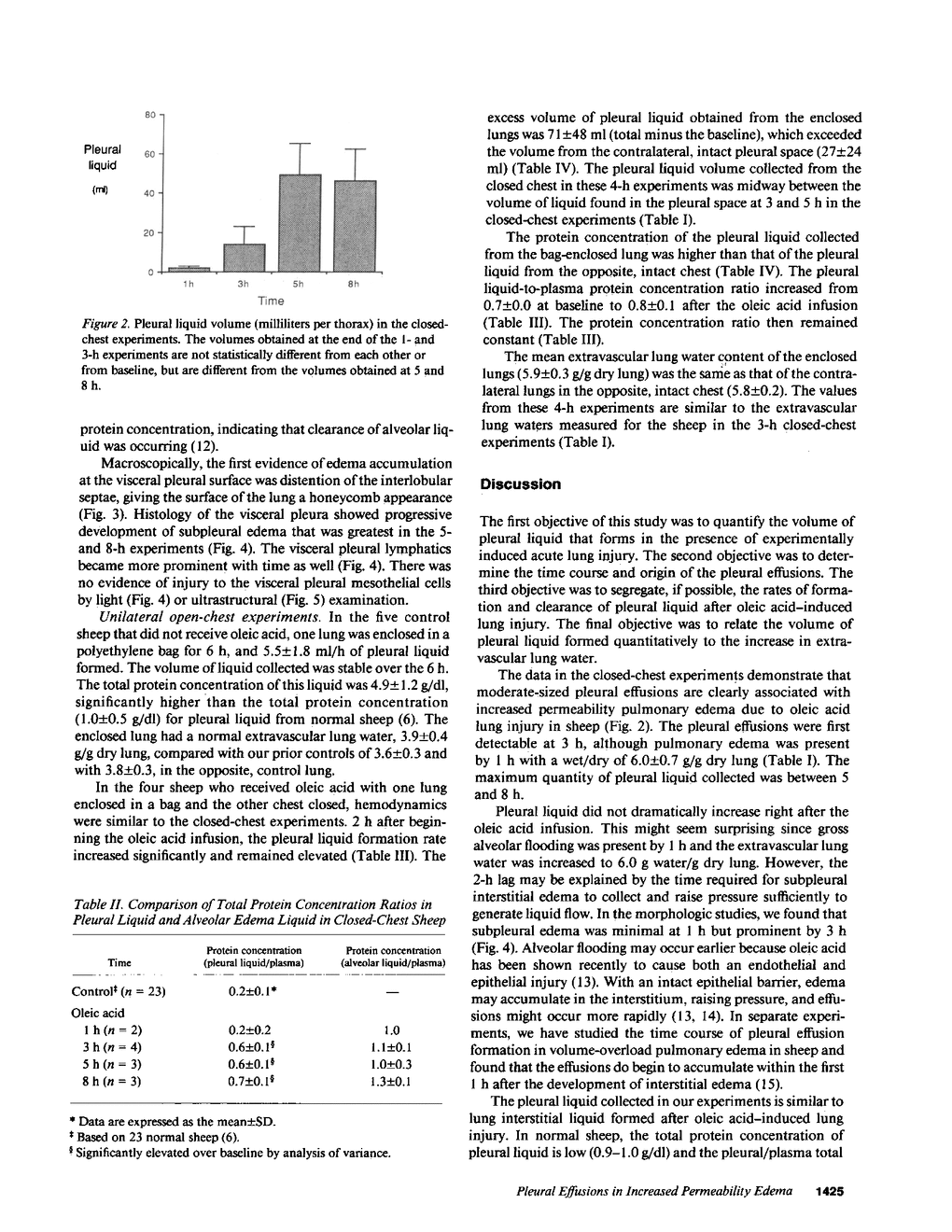 We studied anesthetized sheep to determine the relationship between increased permeability pulmonary edema and the development and mechanism of pleural effusion formation. In 12 sheep with intact, closed thoraces, we studied the time course of pleural liquid formation after 0.12 ml/kg i.v. oleic acid. After 1 h, there were no pleural effusions, even though extravascular lung water increased 50% to 6.0 +/- 0.7 g/g dry lung. By 3 h pleural effusions had formed, they reached a maximum at 5 h (48.5 +/- 16.9 ml/thorax), and at 8 h there was no additional accumulation of pleural liquid (45.5 +/- 16.9 ml). Morphologic studies by light and electron microscopy demonstrated subpleural edema but no detectable injury to the visceral pleura, suggesting that the pleural liquid originated from the lung and not the pleura. In nine sheep, we quantified the rate of formation of pleural liquid by enclosing one lung in a plastic bag. By comparing in the same sheep the volume of pleural liquid collected from the enclosed lung to the volume found in the opposite intact chest, we estimated the rate of liquid absorption from the intact chest to be 0.32 ml/(kg.h); we had previously reported a liquid absorption rate of 0.28 ml/(kg.h) in normal sheep. These studies also supported the conclusion that the majority of the pleural liquid originated from the lung because we could account for all of the pleural liquid that was formed and cleared. The volume of pleural liquid collected from the enclosed lungs was equal to 21% of the excess lung liquid that formed after oleic acid-induced lung injury. Thus, the pleural space and parietal pleural lymphatic pathways are important pathways for the clearance of pulmonary edema liquid after experimentally induced increased permeability pulmonary edema.