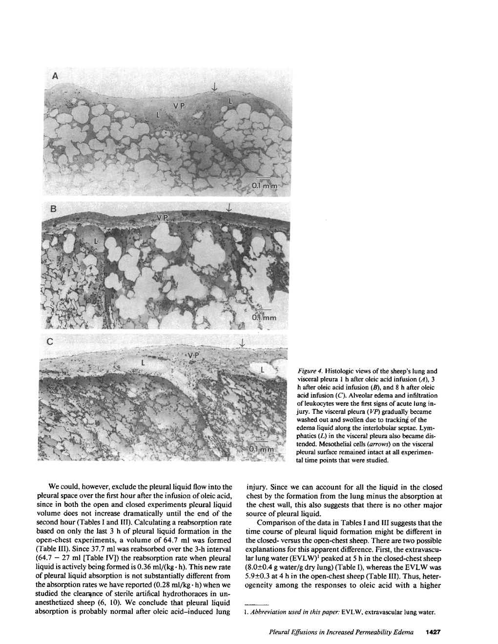 We studied anesthetized sheep to determine the relationship between increased permeability pulmonary edema and the development and mechanism of pleural effusion formation. In 12 sheep with intact, closed thoraces, we studied the time course of pleural liquid formation after 0.12 ml/kg i.v. oleic acid. After 1 h, there were no pleural effusions, even though extravascular lung water increased 50% to 6.0 +/- 0.7 g/g dry lung. By 3 h pleural effusions had formed, they reached a maximum at 5 h (48.5 +/- 16.9 ml/thorax), and at 8 h there was no additional accumulation of pleural liquid (45.5 +/- 16.9 ml). Morphologic studies by light and electron microscopy demonstrated subpleural edema but no detectable injury to the visceral pleura, suggesting that the pleural liquid originated from the lung and not the pleura. In nine sheep, we quantified the rate of formation of pleural liquid by enclosing one lung in a plastic bag. By comparing in the same sheep the volume of pleural liquid collected from the enclosed lung to the volume found in the opposite intact chest, we estimated the rate of liquid absorption from the intact chest to be 0.32 ml/(kg.h); we had previously reported a liquid absorption rate of 0.28 ml/(kg.h) in normal sheep. These studies also supported the conclusion that the majority of the pleural liquid originated from the lung because we could account for all of the pleural liquid that was formed and cleared. The volume of pleural liquid collected from the enclosed lungs was equal to 21% of the excess lung liquid that formed after oleic acid-induced lung injury. Thus, the pleural space and parietal pleural lymphatic pathways are important pathways for the clearance of pulmonary edema liquid after experimentally induced increased permeability pulmonary edema.