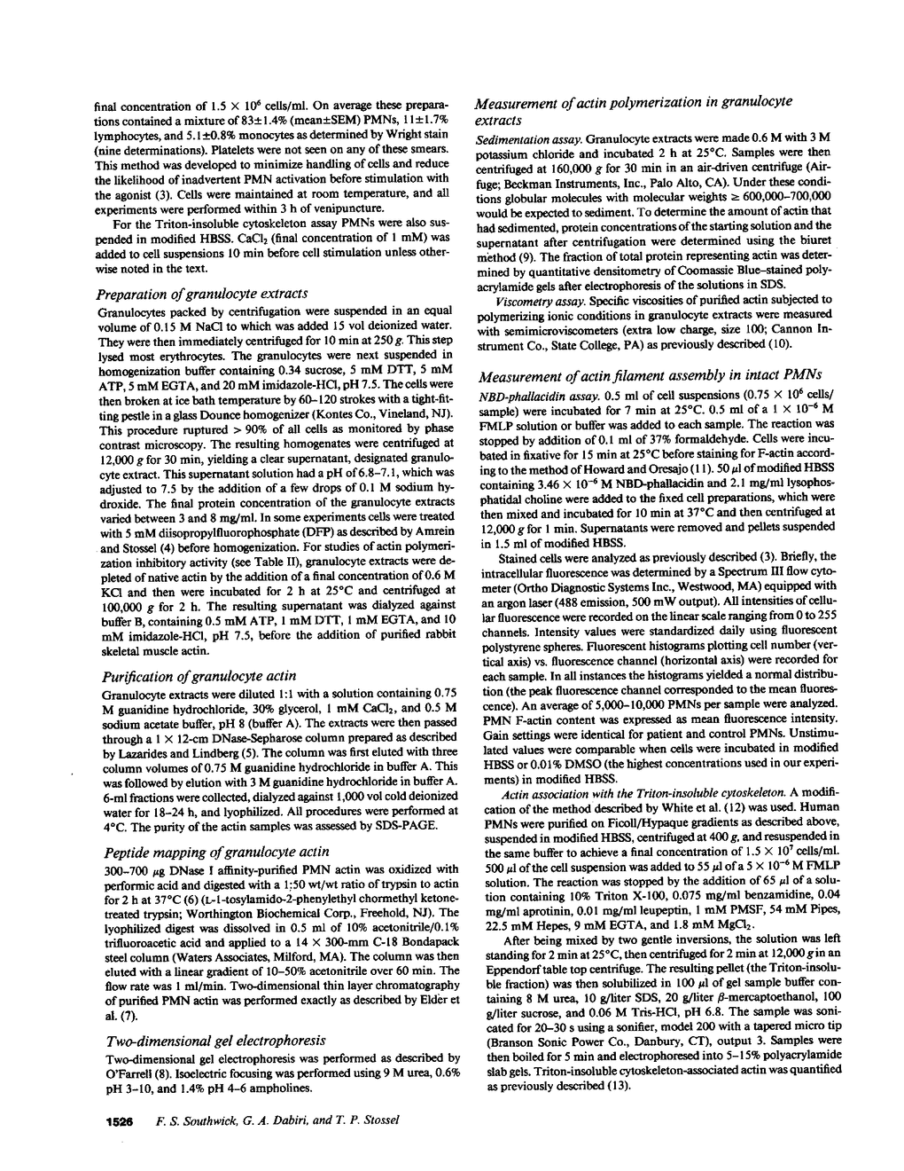A male infant with a severe neutrophil motility disorder and poorly polymerizable actin in PMN extracts was reported over a decade ago to have neutrophil actin dysfunction (NAD) (1974. N. Engl. J. Med. 291:1093-1099). Polymerized actin (F-actin) content of fixed and permeabilized intact neutrophils from the father, mother, and sister of the NAD index case have been measured using nitrobenzoxadiazole-phallacidin, a fluorescent compound which binds specifically to actin filaments. F-actin content of unstimulated PMN from all three family members was significantly lower than unstimulated control PMN (mean 23.6 +/- 0.4 SEM fluorescent units vs. 32.6 +/- 0.6 for controls). After stimulation with the chemotactic peptide FMLP, maximal F-actin content of NAD family member PMN was below that of controls (52.7 +/- 1.3 vs. 72.6 +/- 1.8). F-actin content of detergent insoluble cytoskeletons after stimulation with FMLP was also significantly lower in PMN from NAD family members as compared with controls (21 +/- 6% vs. 73 +/- 8%). PMN extracts from the father and mother, when treated with 0.6 M KCl, polymerized half as much actin as controls. Whereas diisopropylfluorophosphate treatment of normal PMN decreased actin polymerizability in cell extracts, this treatment increased the assembly of actin in parental PMN extract. Addition of purified actin to NAD extracts failed to reveal an abnormal actin polymerization inhibitory activity, and no obvious structural defect in actin purified from the father's PMNs was noted by HPLC and two dimensional thin layer chromatography of tryptic digests. The present studies of actin assembly in intact PMNs confirm that NAD is associated with a true defect in PMN actin assembly and is a genetic disorder that is recessively inherited.
