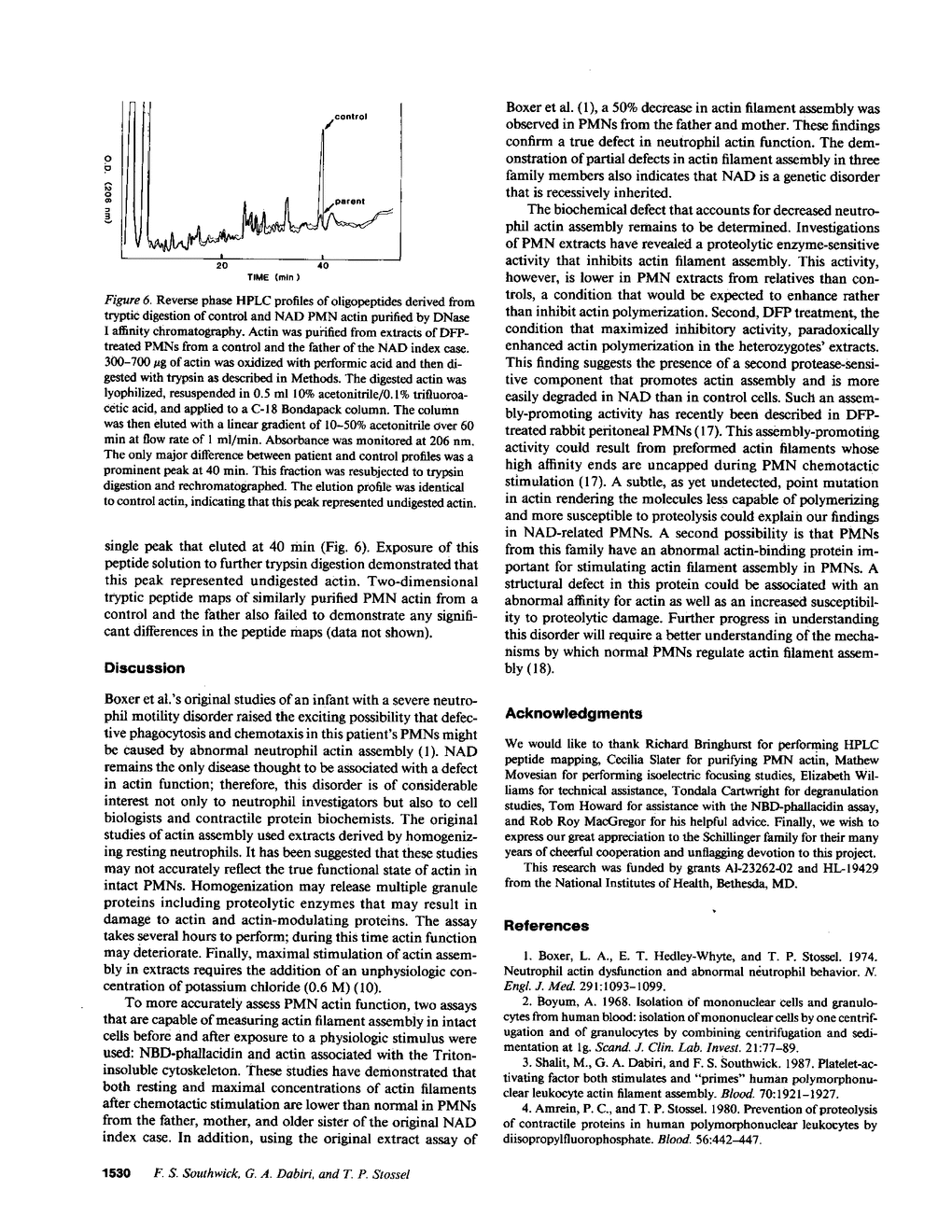 A male infant with a severe neutrophil motility disorder and poorly polymerizable actin in PMN extracts was reported over a decade ago to have neutrophil actin dysfunction (NAD) (1974. N. Engl. J. Med. 291:1093-1099). Polymerized actin (F-actin) content of fixed and permeabilized intact neutrophils from the father, mother, and sister of the NAD index case have been measured using nitrobenzoxadiazole-phallacidin, a fluorescent compound which binds specifically to actin filaments. F-actin content of unstimulated PMN from all three family members was significantly lower than unstimulated control PMN (mean 23.6 +/- 0.4 SEM fluorescent units vs. 32.6 +/- 0.6 for controls). After stimulation with the chemotactic peptide FMLP, maximal F-actin content of NAD family member PMN was below that of controls (52.7 +/- 1.3 vs. 72.6 +/- 1.8). F-actin content of detergent insoluble cytoskeletons after stimulation with FMLP was also significantly lower in PMN from NAD family members as compared with controls (21 +/- 6% vs. 73 +/- 8%). PMN extracts from the father and mother, when treated with 0.6 M KCl, polymerized half as much actin as controls. Whereas diisopropylfluorophosphate treatment of normal PMN decreased actin polymerizability in cell extracts, this treatment increased the assembly of actin in parental PMN extract. Addition of purified actin to NAD extracts failed to reveal an abnormal actin polymerization inhibitory activity, and no obvious structural defect in actin purified from the father's PMNs was noted by HPLC and two dimensional thin layer chromatography of tryptic digests. The present studies of actin assembly in intact PMNs confirm that NAD is associated with a true defect in PMN actin assembly and is a genetic disorder that is recessively inherited.