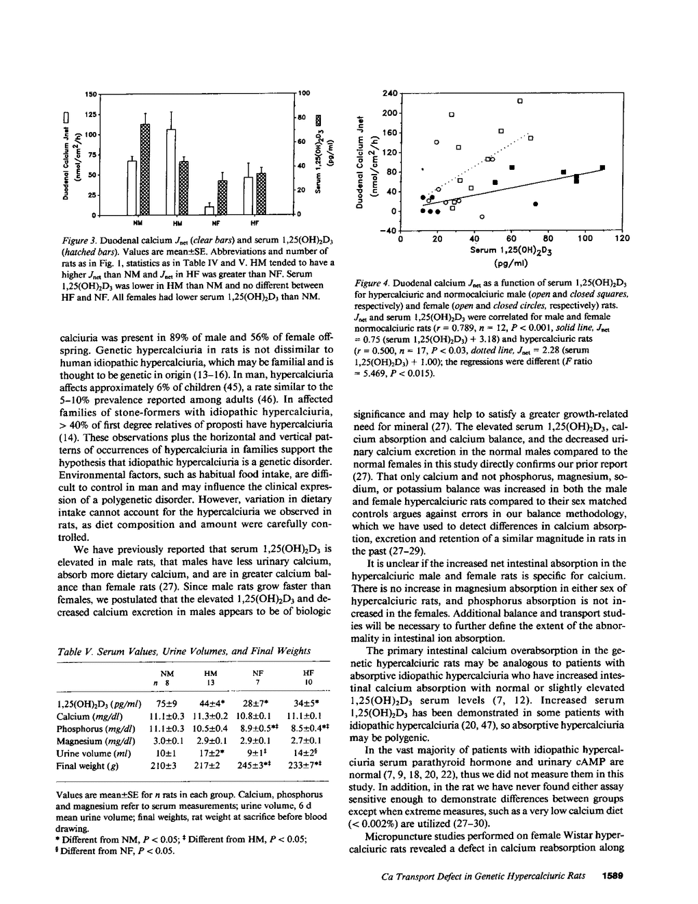 Excessive urine calcium excretion in patients with idiopathic hypercalciuria may involve a primary increase in intestinal calcium absorption, overproduction of 1,25-dihydroxyvitamin D3 or a defect in renal tubular calcium reabsorption. To determine the mechanism of hypercalciuria in an animal model, hypercalciuria was selected for in rats and the most hypercalciuric animals inbred. Animals from the fourth generation were utilized to study mineral balance and intestinal transport in relation to levels of serum 1,25(OH)2D3. Both urine calcium excretion and net intestinal calcium absorption were greater in hypercalciuric males (HM) than in normocalciuric males (NM) and in hypercalciuric females (HF) than in normocalciuric females (NF). However, serum 1,25(OH)2D3 was lower in HM than in NM and not different in HF than in NF. Net calcium balance was more positive in HM than in NM and in HF than in NF. In vitro duodenal calcium net flux was correlated with serum 1,25(OH)2D3 in HM and HF and in NM and NF. However, with increasing serum 1,25(OH)2D3 there was greater calcium net flux in hypercalciuric rats than in normocalciuric controls. Hypercalciuria in this colony of hypercalciuric rats is due to a primary intestinal overabsorption of dietary calcium and not an overproduction of 1,25(OH)2D3 or a defect in the renal tubular reabsorption of calcium.