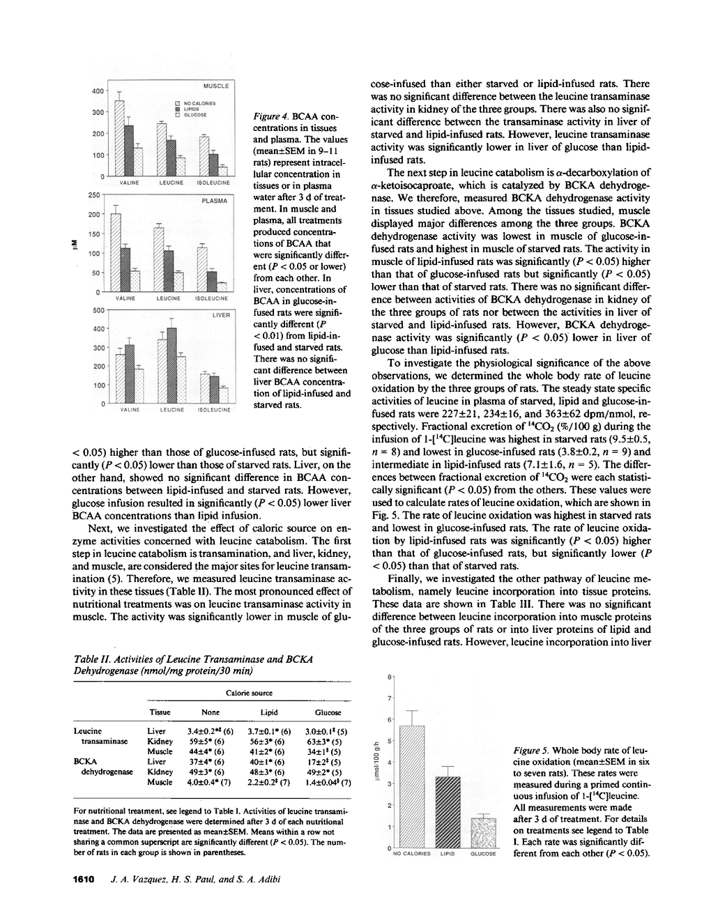 Previously we showed that hypocaloric amounts of glucose reduce leucine catabolism while an isocaloric amount of fat does not (1985. J. Clin. Invest. 76:737.). This study was designed to investigate whether the same difference exists when the entire caloric need is provided either as glucose or lipid. Rats were maintained for 3 d on total parenteral nutrition (350 cal/kg per d), after which the infusion of amino acids was discontinued and rats received the same amount of calories entirely as glucose or lipid for three more days. A third group of rats was infused with saline for 3 d. In comparison to glucose, lipid infusion resulted in higher urinary nitrogen excretion (55 +/- 3 vs. 37 +/- 2 mg N/24 h, P less than 0.05), muscle concentrations of tyrosine (95 +/- 8 vs. 42 +/- 8 microM, P less than 0.01), and leucine (168 +/- 19 vs. 84 +/- 16 microM, P less than 0.01), activity of BCKA dehydrogenase in muscle (2.2 +/- 0.2 vs. 1.4 +/- 0.04 nmol/mg protein per 30 min, P less than 0.05), and whole body rate of leucine oxidation (3.3 +/- 0.5 vs. 1.4 +/- 0.2 mumol/100 g per h, P less than 0.05). However, all these parameters were significantly lower in lipid-infused than starved rats. There was no significant difference between leucine incorporation into liver and muscle proteins of lipid and glucose-infused rats. On the other hand, starved rats showed a lower leucine incorporation into liver proteins. The data show that under conditions of adequate caloric intake lipid has an inhibitory effect on leucine catabolism but not as great as that of glucose. The mechanism of this difference may be related to a lesser inhibition of muscle protein degradation by lipid than glucose, thereby increasing the leucine pool, which in turn stimulates leucine oxidation.