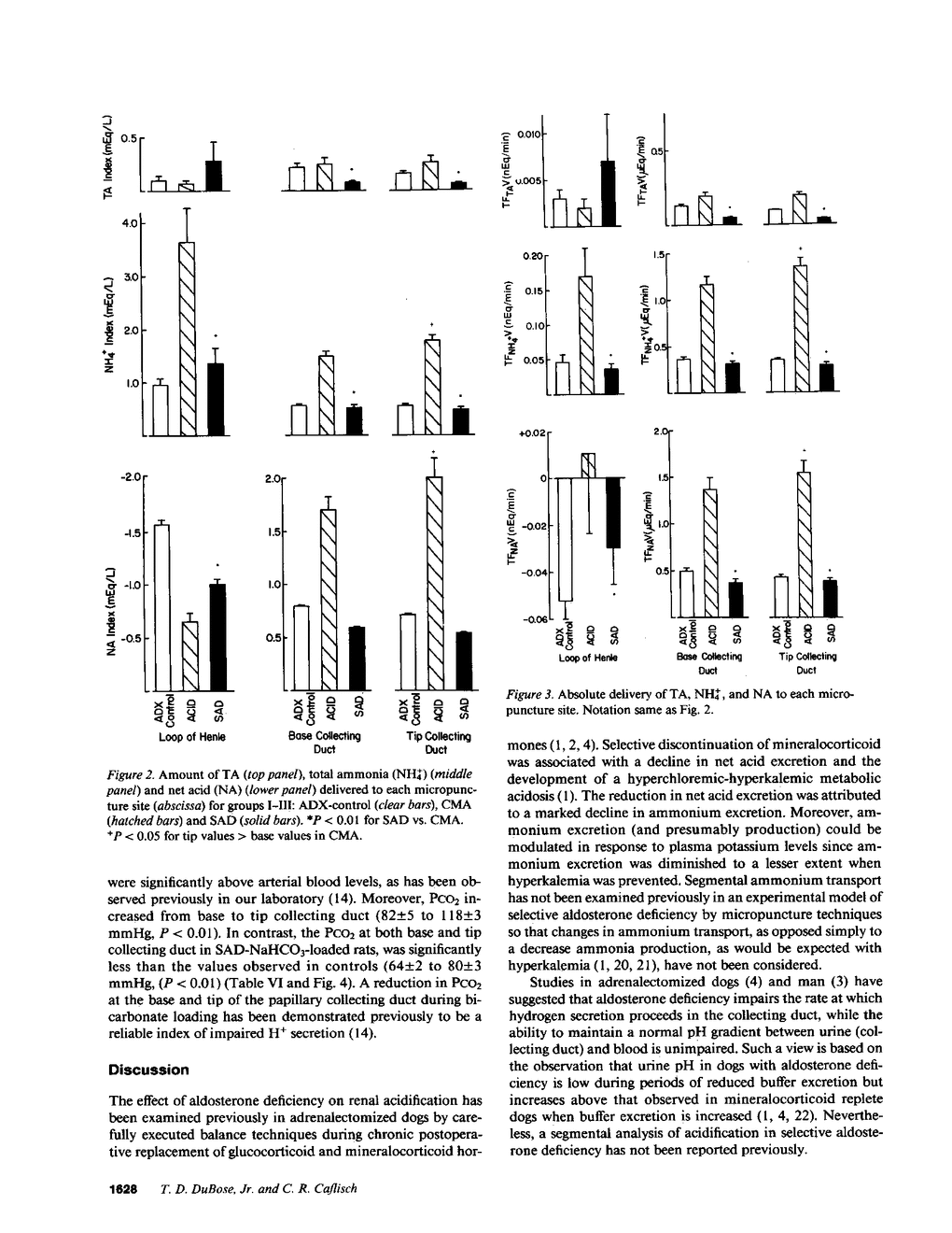 Mineralocorticoid plays a role in urinary acidification and acid-base balance, but the response of the inner medulla to aldosterone has not been elucidated. A model of selective aldosterone deficiency (SAD) with hyperkalemia and hyperchloremic metabolic acidosis was employed to assess segmental acidification by measuring in situ pH, titratable acidity (TA) and total ammonia (Am). Hydrogen ion secretion was also examined as a function of the increment in in situ PCO2 in the collecting duct during bicarbonate loading. SAD rats were compared to ADX controls that received adrenalectomy and chronic replacement of gluco- and mineralocorticoid and to rats with chronic metabolic acidosis induced by oral NH4Cl (CMA). Both fractional and absolute delivery of Am to the loop of Henle was lower in SAD vs. CMA rats (1.34 to 3.63 mM, P less than 0.01). Delivery of Am to the base and tip collecting duct (BCD and TCD) was also markedly lower in SAD (1.50 vs. 0.52 and 1.77 vs. 0.47 mM, respectively, P less than 0.01). Net addition of Am and net acid between BCD and TCD, observed in CMA rats, was not observed in SAD despite equivalent degrees of systemic metabolic acidosis. Similarly, the concentration gradient favoring transfer of NH3 between loop of Henle and CD was reduced in SAD. During bicarbonate loading the increment in PCO2 at BCD, TCD and in final urine was significantly lower in SAD rats than in adrenal intact bicarbonate-loaded rats. Therefore, the acidification defect in this model of SAD appears to be a result of a decrease in ammonia production and delivery to the loop of Henle, impaired transfer from loop to collecting duct and reduction in the rate of H+ secretion by the collecting duct.