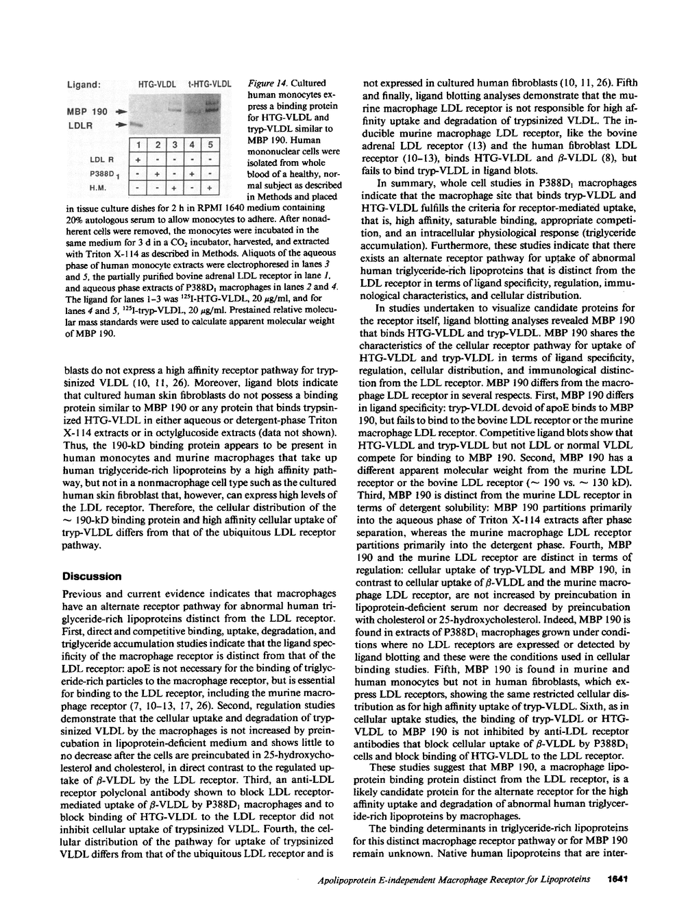 Murine P388D1 macrophages have a receptor pathway that binds human hypertriglyceridemic very low density lipoproteins (HTG-VLDL) that is fundamentally distinct from the LDL receptor pathway. Trypsin-treated HTG-VLDL (tryp-VLDL), devoid of apolipoprotein (apo)-E, fail to bind to the LDL receptor, yet tryp-VLDL and HTG-VLDL cross-compete for binding to P388D1 macrophage receptors, indicating that these lipoproteins bind to the same sites. The specific, high affinity binding of tryp-VLDL and HTG-VLDL to macrophages at 4 degrees C is equivalent and at 37 degrees C both produce rapid, massive, curvilinear (receptor-mediated) triglyceride accumulation in macrophages. Ligand blots show that P388D1 macrophages express a membrane protein of approximately 190 kD (MBP190) that binds both tryp-VLDL and HTG-VLDL; this binding is competed by HTG-VLDL, trypsinized HTG-VLDL, and trypsinized normal VLDL but not by normal VLDL or LDL. The macrophage LDL receptor (approximately 130 kD) and cellular uptake of beta-VLDL, but not MBP 190 nor uptake of tryp-VLDL, are induced when cells are exposed to lipoprotein-deficient medium and decreased when cells are cholesterol loaded. Unlike the macrophage LDL receptor, MBP 190 partitions into the aqueous phase after phase separation of Triton X-114 extracts. An anti-LDL receptor polyclonal antibody blocks binding of HTG-VLDL to the LDL receptor and blocks receptor-mediated uptake of beta-VLDL by P388D1 cells but fails to inhibit specific cellular uptake of tryp-VLDL or to block binding of tryp-VLDL to MBP 190. Human monocytes, but not human fibroblasts, also express a binding protein for HTG-VLDL and tryp-VLDL similar to MBP 190. We conclude that macrophages possess receptors for abnormal human triglyceride-rich lipoproteins that are distinct from LDL receptors in ligand specificity, regulation, immunological characteristics, and cellular distribution. MBP 190 shares these properties and is a likely receptor candidate for the high affinity uptake of TG-rich lipoproteins by macrophages.