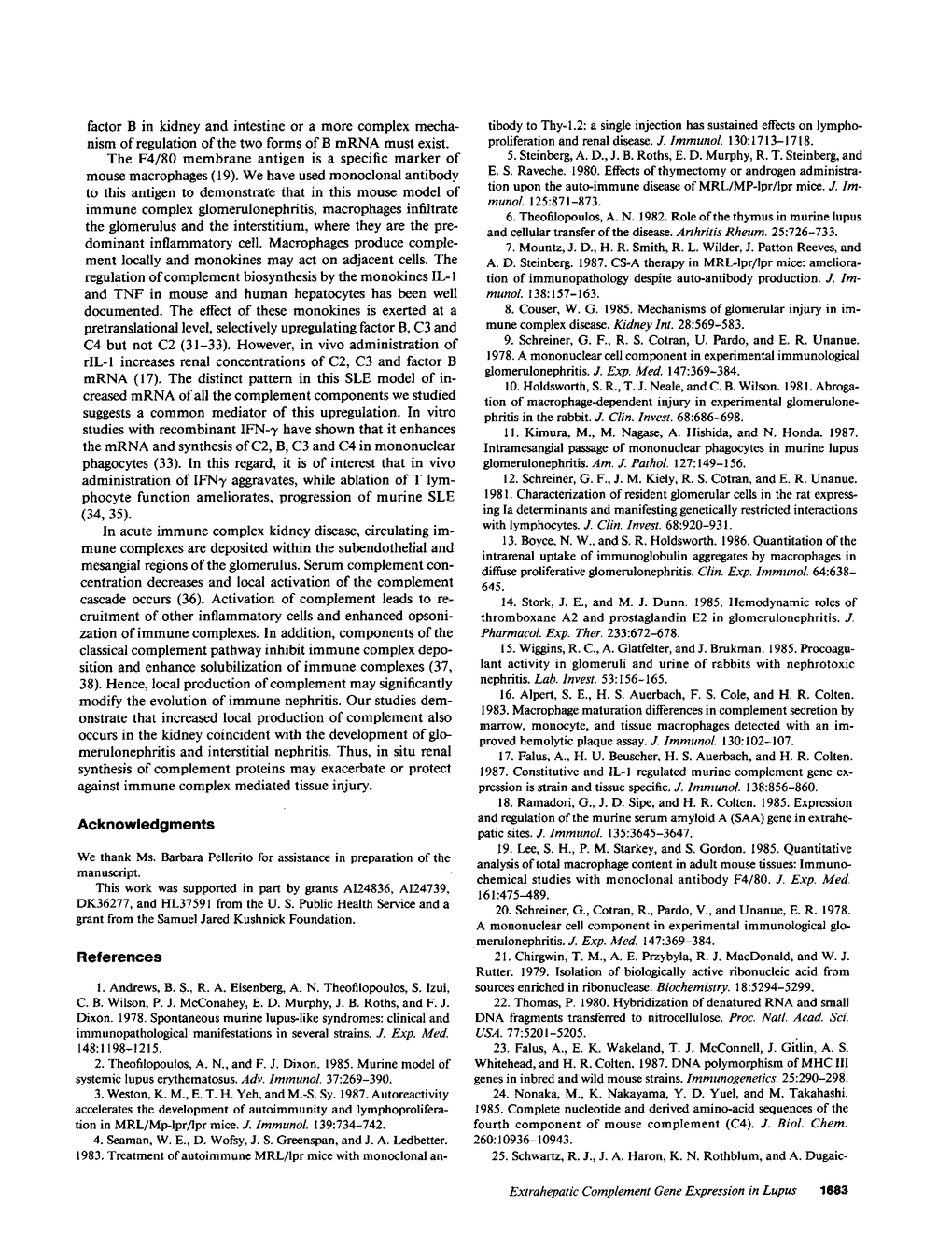 Systemic lupus erythematosus (SLE) is associated with the presence of complement proteins and immune complexes in affected organs. Since complement proteins are synthesized in hepatic and extrahepatic sites, we studied a murine model of SLE to ascertain the relative importance of local and humoral (liver) synthesis of complement. C3, C4, and C2 mRNA increase in kidney coincident with the development of nephritis in the MRL lpr/lpr mouse, a strain that spontaneously develops SLE. Two factor B messenger RNA transcripts are expressed in kidney and intestine; SLE nephritis is associated with decrease in the long factor B mRNA and increase in the short form. Increased local synthesis of C3 and B protein and a concomitant glomerular and renal interstitial macrophage infiltrate paralleled the increase in mRNA content in the (lpr/lpr) mice. In addition to kidney, an increase in C3, C4, C2 and factor B mRNA was noted in the lung, heart and intestine and to a lesser extent in liver of (lpr/lpr) in comparison to the MRL (+/+) animals. These results suggest that in SLE local expression of complement genes plays a role in the pathogenesis of chronic glomerulonephritis and in the autoimmune arteritis of other organs.