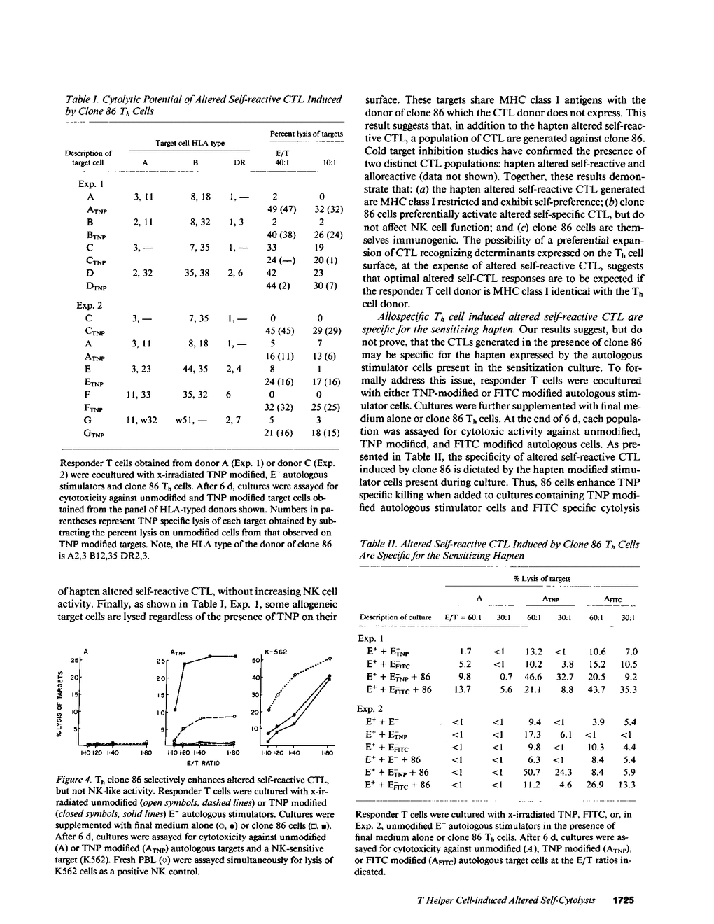 The effect of a cloned allospecific human Th cell, termed 86, on the in vitro generation of altered self-reactive cytolytic T lymphocytes (CTL) was investigated. Utilizing the induction of hapten altered self-reactive CTL as a model for virus or tumor-specific cell-mediated immunity, we determined that the presence of small numbers of clone 86 cells markedly amplified the generation of hapten altered self-reactive CTL. The killer cells induced belong to the CD4-, CD8+ subset, are specific for the hapten-modified autologous stimulator cells present in culture, and are MHC class I restricted. The CTL induced under these culture conditions are readily expanded in the presence of IL-2 with maintenance of efficient and specific altered self-killing. Of interest, clone 86 cells preferentially enhance the growth of CD8+ T cells and selectively amplify altered self-cytolysis but not NK cell activity. Although in vitro clone 86 cells mediate help for CTL generation via the production of lymphokines (IL-4 but little IL-2), one can envision immunotherapeutic strategies for human disease that involve the adoptive transfer of Th cells functionally analogous to clone 86.