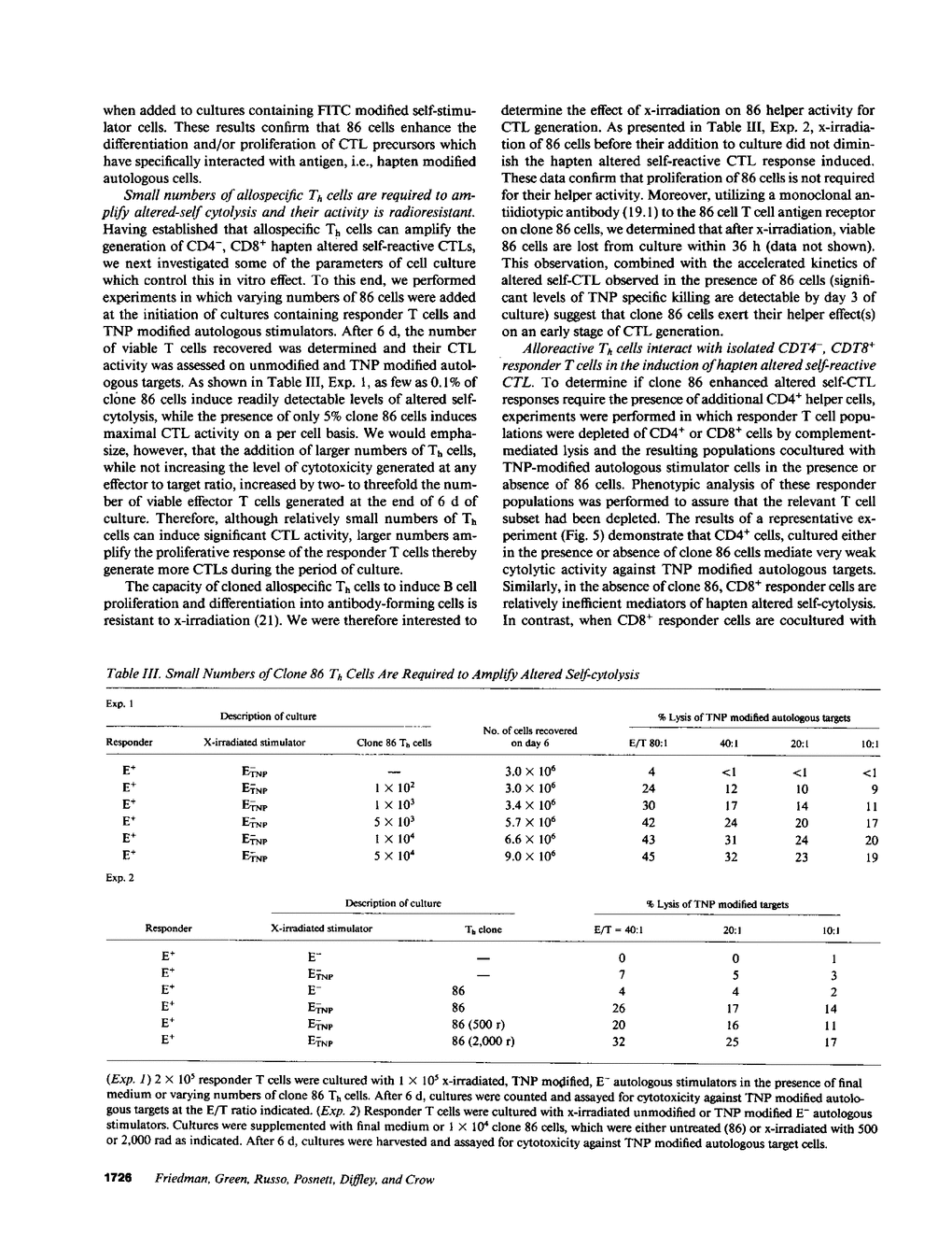 The effect of a cloned allospecific human Th cell, termed 86, on the in vitro generation of altered self-reactive cytolytic T lymphocytes (CTL) was investigated. Utilizing the induction of hapten altered self-reactive CTL as a model for virus or tumor-specific cell-mediated immunity, we determined that the presence of small numbers of clone 86 cells markedly amplified the generation of hapten altered self-reactive CTL. The killer cells induced belong to the CD4-, CD8+ subset, are specific for the hapten-modified autologous stimulator cells present in culture, and are MHC class I restricted. The CTL induced under these culture conditions are readily expanded in the presence of IL-2 with maintenance of efficient and specific altered self-killing. Of interest, clone 86 cells preferentially enhance the growth of CD8+ T cells and selectively amplify altered self-cytolysis but not NK cell activity. Although in vitro clone 86 cells mediate help for CTL generation via the production of lymphokines (IL-4 but little IL-2), one can envision immunotherapeutic strategies for human disease that involve the adoptive transfer of Th cells functionally analogous to clone 86.