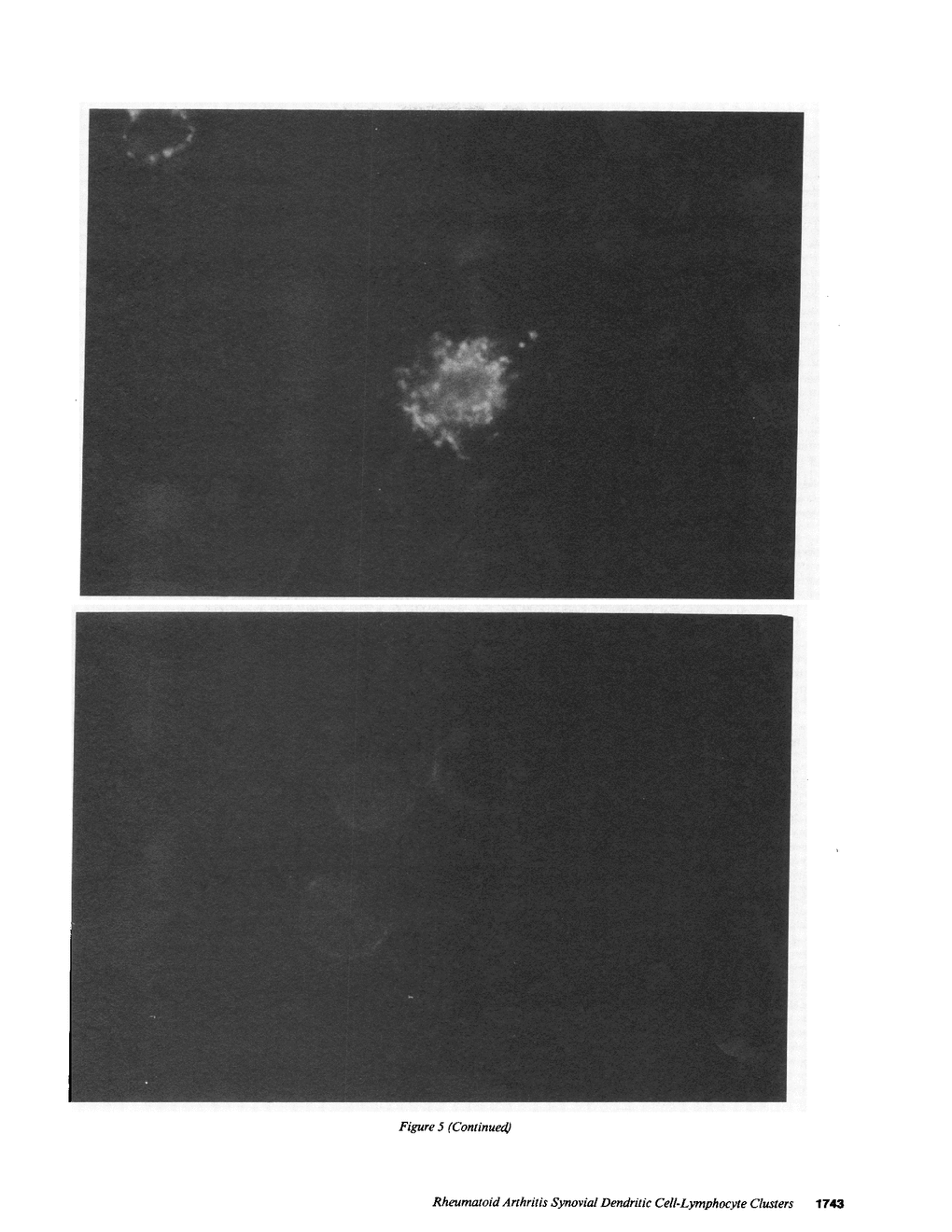 Lymphocytes cluster about dendritic cells (DC) spontaneously in 48 h cultures of rheumatoid arthritis synovial fluid (RA SF) mononuclear cells and in peripheral blood autologous or allogeneic mixed leukocyte reactions. In the latter case, the clusters are predominantly CD4+ T cells (T4/T8 greater than 5) and with time progress in blastic cells that express IL-2 (Tac) and/or transferrin (T9) receptors. In contrast, the clusters in RA SF cultures have a T4/T8 ratio of less than 1 and a majority of the T8 cells coexpress the Leu 7 marker. T cells in these clusters remain inert and with time the clusters disintegrate. Addition of IL-1, IL-2, or IFN-gamma alone or in combination had no effect on RA SF clusters but T cells became blastic when exposed to 10% RA SF. Mixing experiments using RA SF DC with normal T cells and RA T cells with normal DC show that both RA SF DC and T cells are immunofunctional. In addition, clusters of RA SF from a patient with active tuberculosis proliferated vigorously to PPD. Therefore, the unique RA SF cluster profile may reflect the memory nature of the RA SF T cells resulting in a paucity of T cells that are responsive to autologous stimulation. However, an immunosuppressive role for the double-labeled (CD8 and Leu 7) cells has not been excluded.