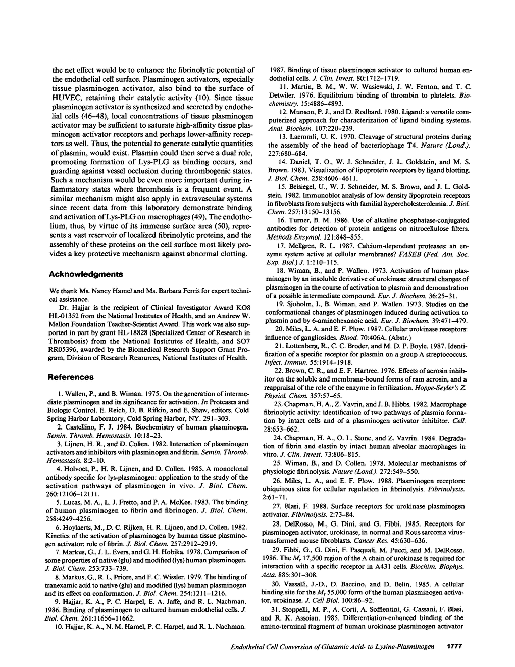 Lysine-plasminogen (Lys-PLG), the plasmin-modified form of native glutamic acid-plasminogen (Glu-PLG), displays enhanced binding affinity for fibrin and also enhanced activation by urokinase and tissue plasminogen activator. We previously demonstrated high-affinity, specific, and functional binding of Glu-PLG as well as tissue plasminogen activator to cultured human umbilical vein endothelial cells (HUVEC). In the present study, we demonstrate binding of Lys-PLG to HUVEC, as well as conversion of Glu-PLG to Lys-PLG at the cell surface. Binding of Lys-PLG to HUVEC was saturable, reversible, epsilon-aminocaproic acid-sensitive, and involved two saturable sites with Kd's of 142 pM and 120 nM, respectively. Upon incubation with Glu-PLG, HUVEC, as well as endothelium in situ, partially converted the ligand to a Lys-PLG-like species. Conversion by HUVEC was blocked by diisopropyl-fluorophosphate, but not by other serine protease inhibitors, including alpha 2-plasmin inhibitor. Eluates of intact umbilical cord vessels contained Lys-PLG by immunoblot analysis. Lys-PLG was also identified immunohistochemically on the endothelial surface of vessels from a variety of normal and inflamed tissues. Thus, endothelial cells appear to actively modify circulating Glu-PLG, bind Lys-PLG to their surface, and thus enhance the fibrinolytic potential of the blood vessel wall.