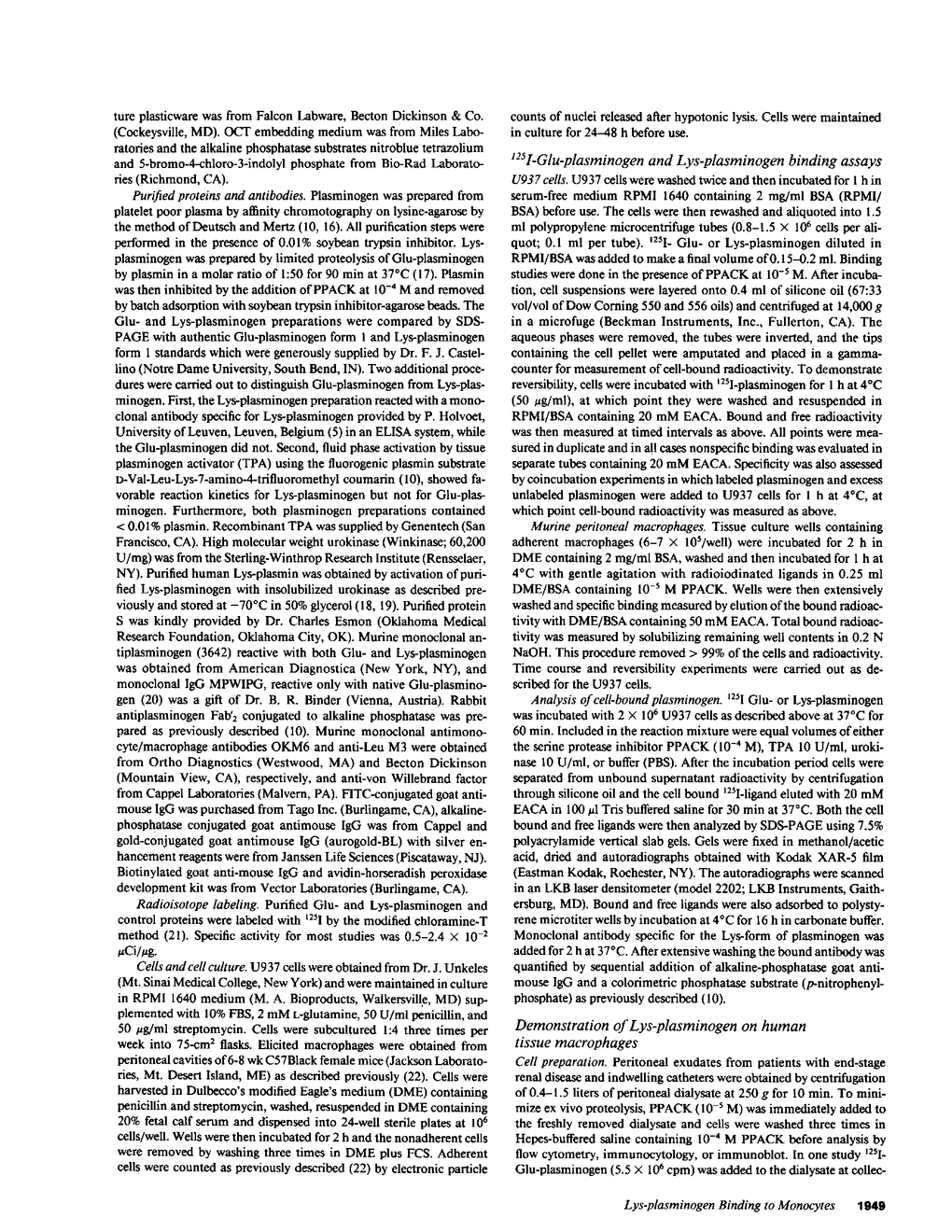 The ability of mononuclear phagocytes to assemble and activate components of the fibrinolytic system on their surfaces may be crucial in effecting an efficient inflammatory response. Lys-plasminogen, the plasmin modified form of this zymogen, was found to bind specifically and with high affinity to murine peritoneal macrophages and to cells of the human monocytoid line U937. This modified plasminogen has been shown to be a more efficient substrate for plasminogen activators than native Glu-plasminogen. Binding was lysine binding site dependent, rapid and reversible. In contrast, although native Glu-plasminogen bound specifically to these cells, affinity was low. Lys-plasminogen inhibited the binding of Glu-plasminogen but the opposite was not true. Molecular analysis of the bound ligands indicated that Glu-plasminogen was converted to Lys-plasminogen and Lys-plasminogen to plasmin on the cell surface but not in the supernatant. Peritoneal macrophages from patients with indwelling catheters and tissue macrophages in chronic inflammatory lesions were shown to express immunologically identified Lys-plasminogen on their surfaces. Therefore binding and surface activation of kinetically favored Lys-plasminogen may provide an important physiological mechanism for localizing proteolytic activity on the surface of inflammatory cells.