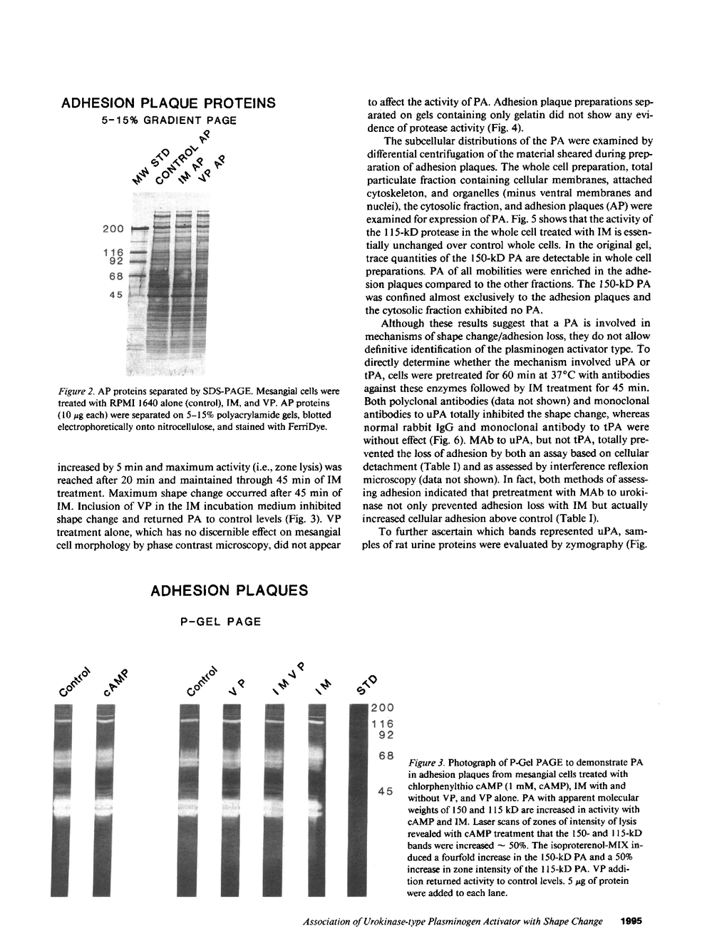 Mesangial cells in culture change shape and become less adhesive in response to cAMP elevation (e.g., treatment with isoproterenol plus isobutylmethylxanthine (IM). Inhibitors of serine proteases inhibit cellular shape change in response to IM. To further examine the role of cell surface proteases in shape change, adhesion plaque proteins (i.e., preparations of ventral membranes and extracellular matrix) were separated in SDS-polyacrylamide gels containing gelatin with and without plasminogen. Four discrete zones of lysis were evident in plasminogen gels (indicative of activation of plasminogen) from control adhesion plaques: one inconspicuous zone with a Mr approximately 150 kD, another at approximately 115 kD, and a doublet at approximately 35-32 kD. Another diffuse zone of lysis centered around Mr approximately 70 kD and contained a defined band of approximately 56 kD. Adhesion plaques contained most of the plasminogen activators (PA). 5 min after IM treatment, the Mr approximately 150- and approximately 115-kD PA were increased in activity. Vasopressin (VP), which prevented shape change and adhesion loss when added along with IM, inhibited the increase in these PA. Preincubation with monoclonal or polyclonal antibodies to urokinase-type plasminogen activator (uPA) totally inhibited the IM-inducible shape change and adhesion loss. Activation of plasminogen throughout the gels revealed multiple protease resistant bands that markedly increased with IM treatment (maximal at 45 min). These may represent focal control mechanisms. uPA thus may mediate focal proteolysis, which results in shape change and decreased adhesion.