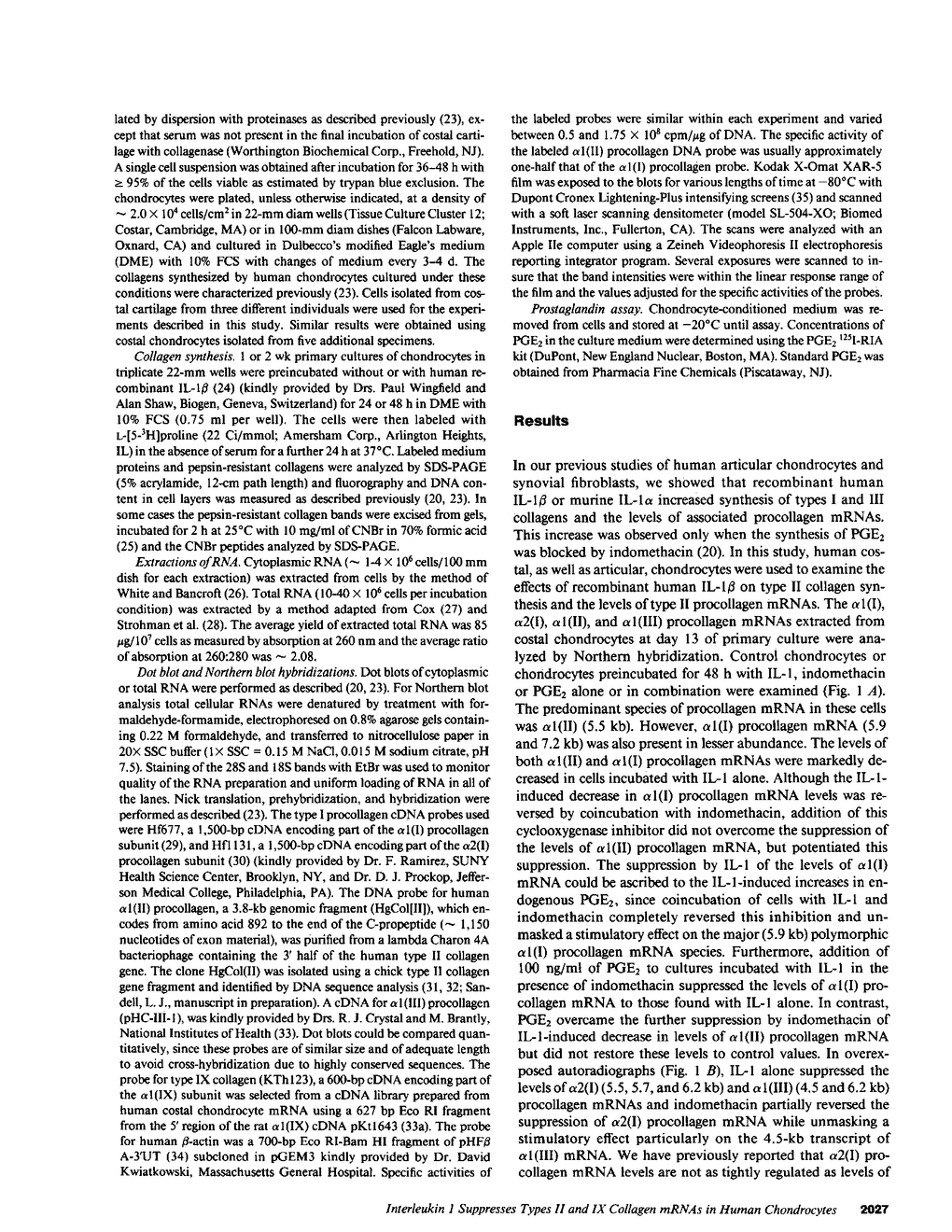 In inflammatory diseases such as rheumatoid arthritis, functions of chondrocytes including synthesis of matrix proteins and proteinases are altered through interactions with cells of the infiltrating pannus. One of the major secreted products of mononuclear inflammatory cells is IL-1. In this study we found that recombinant human IL-1 beta suppressed synthesis of cartilage-specific type II collagen by cultured human costal chondrocytes associated with decreased steady state levels of alpha 1 (II) and alpha 1(IX) procollagen mRNAs. In contrast, IL-1 increased synthesis of types I and III collagens and levels of alpha 1(I), alpha 2(I), and alpha 1(III) procollagen mRNAs, as we described previously using human articular chondrocytes and synovial fibroblasts. This stimulatory effect of IL-1 was observed only when IL-1-stimulated PGE2 synthesis was blocked by the cyclooxygenase inhibitor indomethacin. The suppression of type II collagen mRNA levels by IL-1 alone was not due to IL-1-stimulated PGE2, since addition of indomethacin did not reverse, but actually potentiated, this inhibition. Continuous exposure of freshly isolated chondrocytes from day 2 of culture to approximately half-maximal concentrations of IL-1 (2.5 pM) completely suppressed levels of type II collagen mRNA and increased levels of types I and III collagen mRNAs, thereby reversing the ratio of alpha 1(II)/alpha 1(I) procollagen mRNAs from greater than 6.0 to less than 1.0 by day 7. IL-1, therefore, can modify, at a pretranslational level, the relative amounts of the different types of collagen synthesized in cartilage and thereby could be responsible for the inappropriate repair of cartilage matrix in inflammatory conditions.