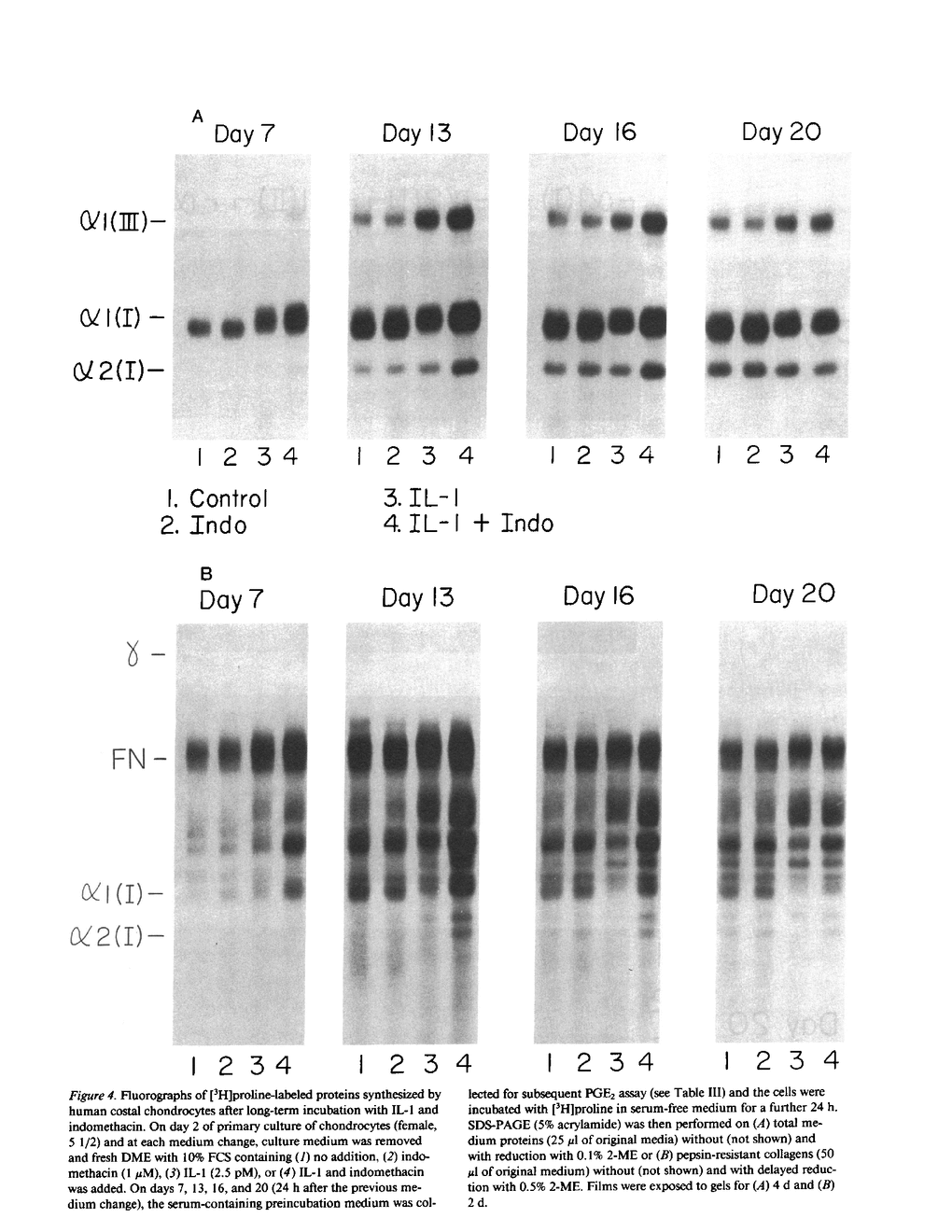 In inflammatory diseases such as rheumatoid arthritis, functions of chondrocytes including synthesis of matrix proteins and proteinases are altered through interactions with cells of the infiltrating pannus. One of the major secreted products of mononuclear inflammatory cells is IL-1. In this study we found that recombinant human IL-1 beta suppressed synthesis of cartilage-specific type II collagen by cultured human costal chondrocytes associated with decreased steady state levels of alpha 1 (II) and alpha 1(IX) procollagen mRNAs. In contrast, IL-1 increased synthesis of types I and III collagens and levels of alpha 1(I), alpha 2(I), and alpha 1(III) procollagen mRNAs, as we described previously using human articular chondrocytes and synovial fibroblasts. This stimulatory effect of IL-1 was observed only when IL-1-stimulated PGE2 synthesis was blocked by the cyclooxygenase inhibitor indomethacin. The suppression of type II collagen mRNA levels by IL-1 alone was not due to IL-1-stimulated PGE2, since addition of indomethacin did not reverse, but actually potentiated, this inhibition. Continuous exposure of freshly isolated chondrocytes from day 2 of culture to approximately half-maximal concentrations of IL-1 (2.5 pM) completely suppressed levels of type II collagen mRNA and increased levels of types I and III collagen mRNAs, thereby reversing the ratio of alpha 1(II)/alpha 1(I) procollagen mRNAs from greater than 6.0 to less than 1.0 by day 7. IL-1, therefore, can modify, at a pretranslational level, the relative amounts of the different types of collagen synthesized in cartilage and thereby could be responsible for the inappropriate repair of cartilage matrix in inflammatory conditions.