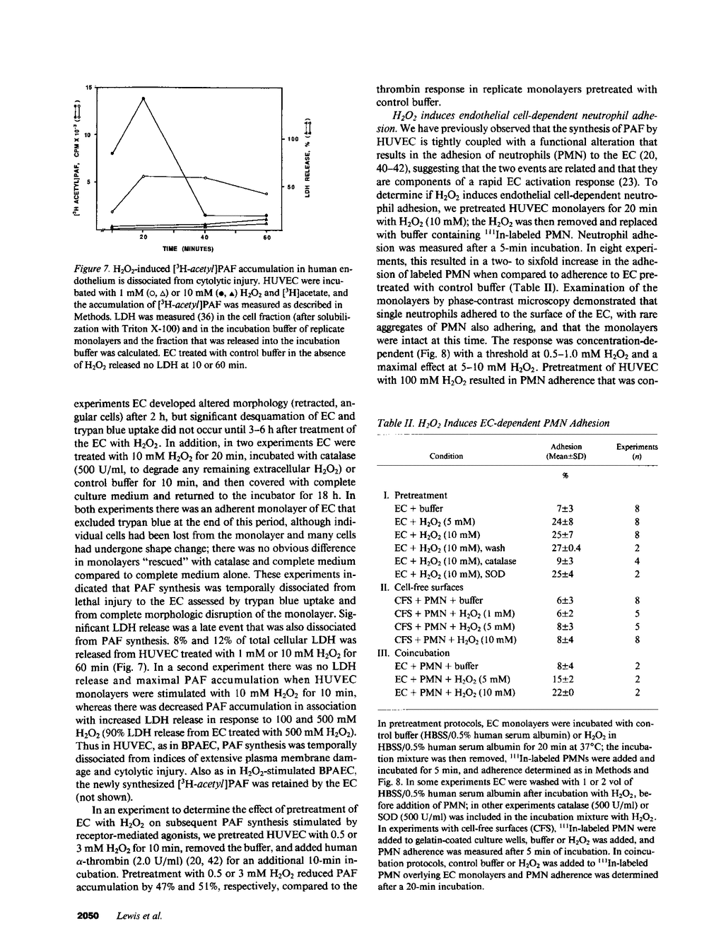 Oxidant-induced damage to the intima of pulmonary and systemic vessels is thought to be an important mechanism of injury in a variety of syndromes of vascular damage. Hydrogen peroxide (H2O2) is an active oxygen metabolite that may induce intimal injury by cytolytic attack or by inducing biochemical and functional alterations in the endothelial cells (EC); however, mechanisms involved in noncytolytic perturbation of EC are largely unknown. We found that H2O2 stimulated the synthesis of platelet-activating factor (PAF) by primary cultures of bovine pulmonary artery endothelium (BPAEC) and by human umbilical vein endothelium (HUVEC). In each cell type the incorporation of [3H]acetate into [3H-acetyl]PAF was concentration- and time-dependent and was temporally dissociated from severe plasma membrane disruption and cytolytic cell injury; the newly synthesized PAF remained associated with the EC. H2O2 caused permeabilization of EC to 45Ca2+ and an increase in intracellular Ca2+, suggesting that a transmembrane Ca2+ flux is the signal that initiates PAF synthesis. H2O2 also induced the endothelial cell-dependent adhesion of neutrophils to HUVEC monolayers. This response was rapid, with an onset within minutes and a subsequent time course that paralleled the time course of PAF accumulation, and was dependent on extracellular Ca2+ but not on de novo protein synthesis. These studies demonstrate that H2O2 can induce two rapid activation responses of endothelium, PAF synthesis and EC-dependent neutrophil adhesion, events that may be important in physiologic and pathologic inflammation.