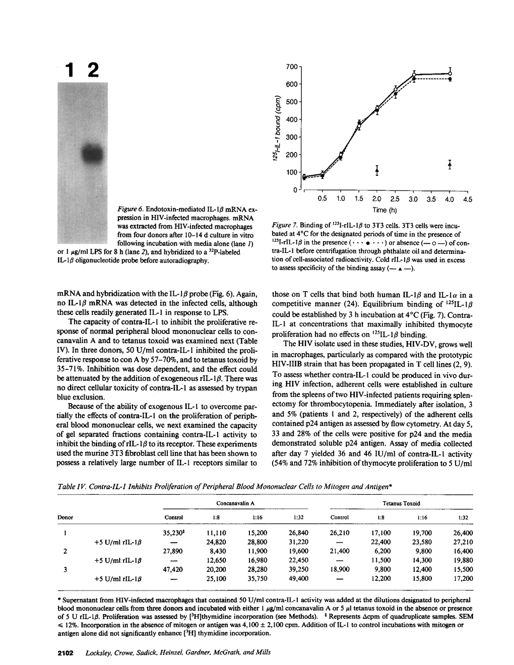 Infection of monocyte-macrophages with human immunodeficiency virus may be central to the pathogenesis of the acquired immunodeficiency syndrome. The ability of infected macrophages to prime T cells through IL-1 production was investigated in vitro. Purified human monocytes maintained in suspension culture were infected with strain HIV-DV. Intracellular expression of virus p24 antigen increased from undetectable levels immediately after infection to 13-59% of cells by 10-14 d; infected macrophages remained viable for up to 60 d. Supernatants collected between 14 and 20 d after infection were examined in the murine thymocyte co-mitogenesis assay and demonstrated to contain a potent IL-1 inhibitor, designated contra-IL-1. Contra-IL-1 activity was present in all supernatants examined after 4 d of infection, and peaked coincident with peak p24 antigen expression. Inhibitory activity was not present in uninfected cells. Contra-IL-1 activity eluted after gel filtration with an approximate molecular weight of 9 kD. Inhibitory activity was removed by exposure to heat or acid pH, or by incubation with chymotrypsin or staphylococcal V8 protease. Contra-IL-1 did not inhibit IL-2- or IL-4-dependent proliferation of murine T cell lines. Despite its ability to inhibit IL-1 activity, contra-IL-1 did not interfere with the binding of recombinant IL-1 beta to a fibroblast cell line. Contra-IL-1 inhibited the proliferation of normal peripheral blood mononuclear cells to both concanavalin A and tetanus toxoid; inhibition could be attenuated by the addition of exogenous IL-1. Messenger RNA extracted from infected macrophages was examined by Northern analysis for the presence of message to IL-1 beta. No message was apparent, suggesting that the presence of contra-IL-1 was not obscuring the concomitant release of IL-1. Infected macrophages stimulated with endotoxin generated readily detectable message for IL-1 beta. Spleen macrophages purified from two patients with AIDS complicated by immune thrombocytopenia spontaneously expressed p24 antigen in vitro and released contra-IL-1 activity into the media. Contra-IL-1 may contribute to the immune dysfunction of AIDS.