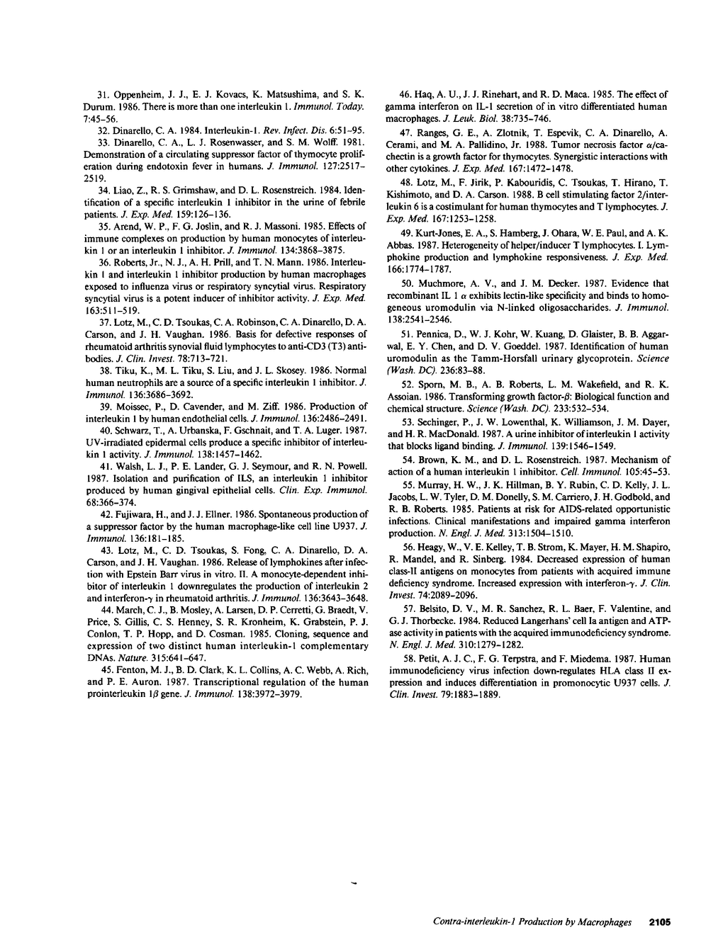 Infection of monocyte-macrophages with human immunodeficiency virus may be central to the pathogenesis of the acquired immunodeficiency syndrome. The ability of infected macrophages to prime T cells through IL-1 production was investigated in vitro. Purified human monocytes maintained in suspension culture were infected with strain HIV-DV. Intracellular expression of virus p24 antigen increased from undetectable levels immediately after infection to 13-59% of cells by 10-14 d; infected macrophages remained viable for up to 60 d. Supernatants collected between 14 and 20 d after infection were examined in the murine thymocyte co-mitogenesis assay and demonstrated to contain a potent IL-1 inhibitor, designated contra-IL-1. Contra-IL-1 activity was present in all supernatants examined after 4 d of infection, and peaked coincident with peak p24 antigen expression. Inhibitory activity was not present in uninfected cells. Contra-IL-1 activity eluted after gel filtration with an approximate molecular weight of 9 kD. Inhibitory activity was removed by exposure to heat or acid pH, or by incubation with chymotrypsin or staphylococcal V8 protease. Contra-IL-1 did not inhibit IL-2- or IL-4-dependent proliferation of murine T cell lines. Despite its ability to inhibit IL-1 activity, contra-IL-1 did not interfere with the binding of recombinant IL-1 beta to a fibroblast cell line. Contra-IL-1 inhibited the proliferation of normal peripheral blood mononuclear cells to both concanavalin A and tetanus toxoid; inhibition could be attenuated by the addition of exogenous IL-1. Messenger RNA extracted from infected macrophages was examined by Northern analysis for the presence of message to IL-1 beta. No message was apparent, suggesting that the presence of contra-IL-1 was not obscuring the concomitant release of IL-1. Infected macrophages stimulated with endotoxin generated readily detectable message for IL-1 beta. Spleen macrophages purified from two patients with AIDS complicated by immune thrombocytopenia spontaneously expressed p24 antigen in vitro and released contra-IL-1 activity into the media. Contra-IL-1 may contribute to the immune dysfunction of AIDS.