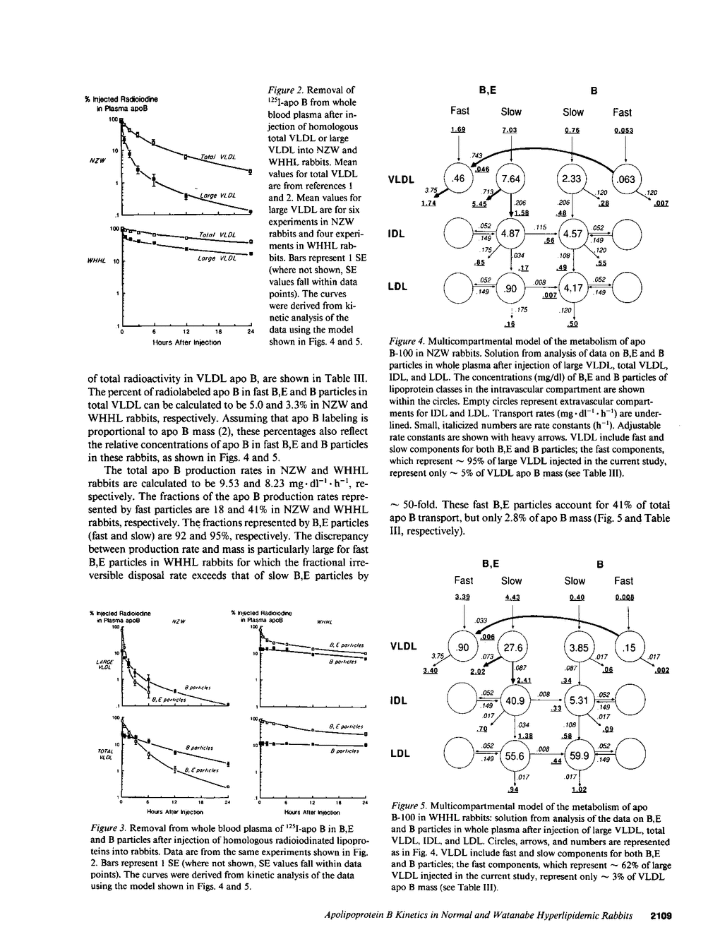 The metabolism of radioiodinated apo B-100 in large VLDL from normal and Watanabe heritable hyperlipidemic (WHHL) rabbits, with diameters exceeding 450 A, was studied in corresponding recipient rabbits. In both cases approximately 87% of the particles contained apolipoprotein (apo) E (B,E particles). In normal rabbits, apo B in these B,E particles was removed from blood plasma much more rapidly than apo B in B,E particles in smaller VLDL and few of the large B,E particles were converted to lipoproteins of higher density. In WHHL rabbits, approximately 60% of the apo B in B,E particles in large VLDL was removed at a comparably rapid rate, but an appreciable fraction of the remainder, which was removed slowly, was converted to particles of higher density, as are the B,E particles in smaller VLDL. From kinetic analysis of these and other data, an hypothesis was formulated from which it is estimated that apo B in large VLDL accounts for 18 and 41% of apo B transport in normal and WHHL rabbits, respectively, despite the fact that these lipoproteins contain less than 5% of the apo B in total VLDL. Failure to account for the contribution of large VLDL to VLDL turnover may lead to serious underestimation of total apo B transport in the blood.