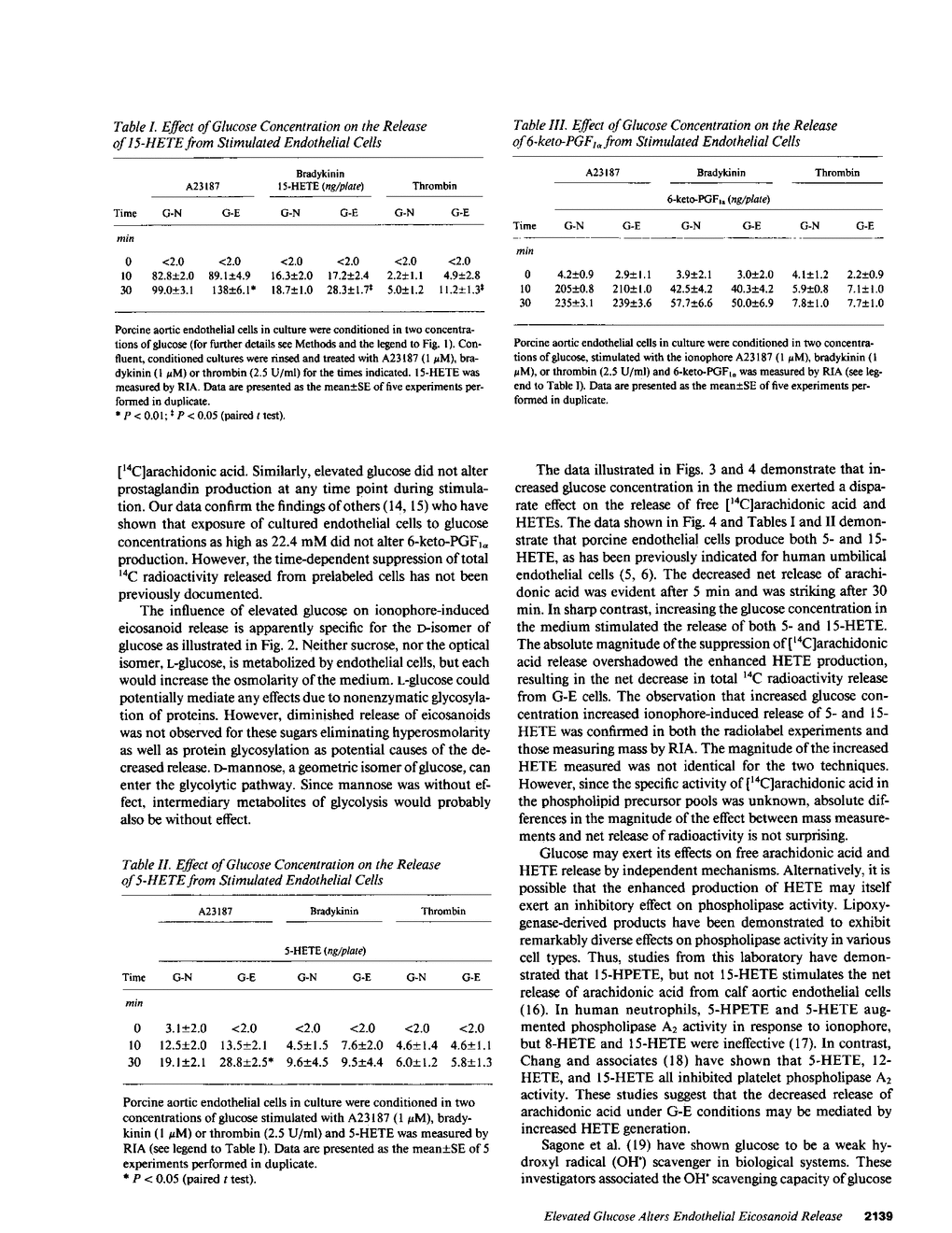 Cultured porcine aortic endothelial cells were conditioned through two passages to mimic euglycemic and hyperglycemic conditions (5.2 mM, normal glucose; 15.6 mM, elevated glucose). After incubation with 1 microM [14C]arachidonic acid for 24 h, the cells were stimulated with 1 microM A23187 for times up to 30 min. Uptake of [14C]arachidonic acid and its distribution among cell lipids were unaffected by the increased glucose concentration. The release of eicosanoids from labeled cells and unlabeled cells was measured by reverse-phase HPLC and by RIA, respectively. Compared with cells stimulated in the presence of normal glucose concentrations, cells stimulated in the presence of elevated glucose released 62.6% less free [14C]arachidonic acid, but released 129% more 14C-labeled 15-hydroxyeicosatetraenoic acid (HETE). Increased release of 15-HETE in the presence of elevated glucose in response to A23187, bradykinin, and thrombin was confirmed by RIA. A similar increase in 5-HETE release was observed by RIA after A23187 treatment. The release of both radiolabeled and unlabeled prostanoids was equal at both glucose concentrations. The data indicate that glucose may play an important role in the regulation of release and metabolism of arachidonic acid after agonist stimulation. In the presence of elevated glucose concentrations, such as those associated with diabetes mellitus, the extent and pattern of eicosanoid release from endothelial cells is markedly altered.