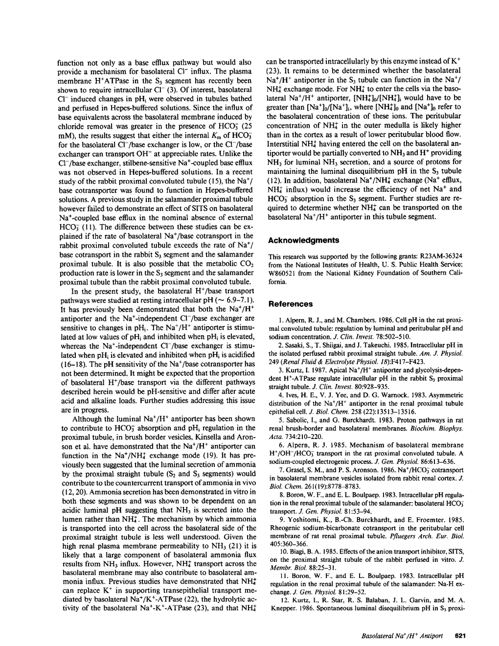The basolateral membrane Na+ and Cl(-)-dependent acid-base transport processes were studied in the isolated perfused rabbit S3 proximal straight tubule. Intracellular pH (pHi) was measured with 2'7'-biscarboxyethyl-5,6-carboxyfluorescein (BCECF) and a microfluorometer coupled to the tubule perfusion apparatus. Reduction of basolateral HCO3- from 25 to 5 mM caused pHi to decrease at a rate of 0.81 pH/min. Approximately 50% of this rate was Na+-dependent, 30% Cl(-)-dependent and 20% Na+ and Cl(-)-independent. Two basolateral Na+-dependent acid base transport pathways were detected: (a) an amiloride-sensitive Na+/H+ antiporter and (b) a stilbene-sensitive Na+/base cotransporter. No evidence was found for a Na+-dependent Cl-/base exchanger. The Cl(-)-dependent component of basolateral base efflux was mediated by a stilbene-sensitive Na+-independent Cl-/base exchange pathway. The results suggest that the acid base transport pathways of the basolateral membrane of the S3 proximal tubule differ from more proximal nephron segments.