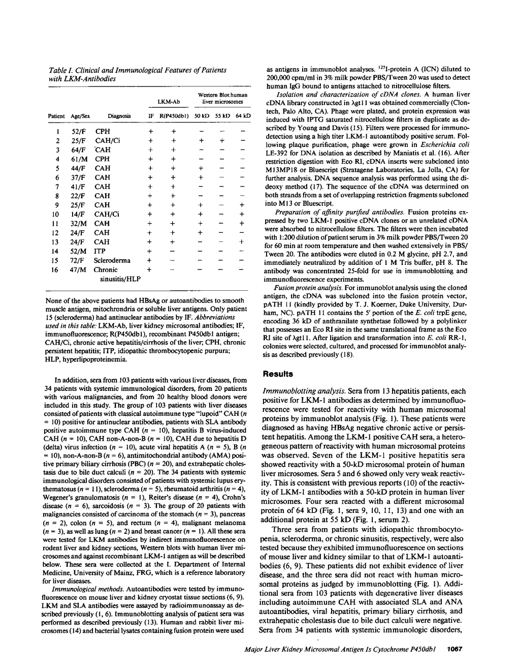 Type 1, liver kidney microsomal autoantibodies (LKM-1) are associated with a subgroup of idiopathic autoimmune type, chronic active hepatitis (CAH). The antigenic specificity of LKM-1 autoantibodies from 13 patients was investigated by immunoblot analysis of human liver microsomal proteins. Polypeptides of 50, 55, and 64 kD were detected with these antisera. A high titer LKM-1 serum was selected to screen a human liver lambda gt11 cDNA expression library, resulting in the isolation of several complementary (c)DNA clones. Autoantibodies affinity purified from proteins expressed by two of the immunopositive cDNA clones, HLD8.2 and HLD13.2, specifically react with a 50-kD protein of human liver microsomes and display immunofluorescence staining of the proximal renal tubular epithelia characteristic of LKM-1 sera. Determination of the sequence of HLD8.2 revealed that it encodes a recently described cytochrome P450db1. A bacterial fusion protein constructed from HLD8.2 proved to be a specific and sensitive diagnostic reagent. All sera from patients with LKM-1 positive liver disease react with this fusion protein. No reaction was seen, however, for sera from patients with other types of autoimmune liver diseases, viral hepatitis, systemic immunological disorders, or healthy controls.