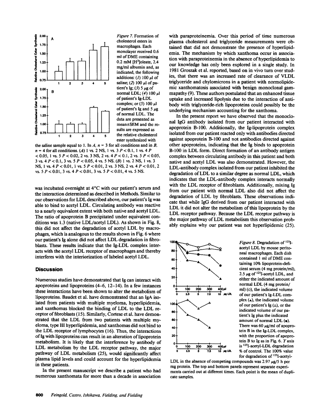 In the present report we describe a patient with multiple myeloma and long-standing paraproteinemia who developed xanthoma in the absence of an elevation in plasma cholesterol or triglyceride concentrations. Studies demonstrated that our patient's monoclonal IgG antibody interacted with apoprotein B-100. The LDL-antibody complex isolated from our patient did not affect the degradation of LDL by human fibroblasts, indicating that while IgG derived from our patient interacted with LDL it did not alter the metabolism of this lipoprotein by the LDL receptor pathway. Since the LDL receptor pathway is the major route of LDL metabolism, this probably explains why our patient was not hyperlipidemic. In contrast to an absence of effect on the LDL receptor, our patient's LDL-antibody complex stimulated cholesterol esterification within macrophages indicating the uptake and degradation of the LDL-antibody complex. The LDL-antibody complex inhibited the degradation of acetyl LDL by macrophages (scavenger pathway), demonstrating that our patient's LDL-antibody complex was recognized as a modified LDL. Moreover, mixing Ig from our patient with normal LDL also resulted in the normal LDL increasing the esterification of cholesterol by macrophages. One can hypothesize that our patient's monoclonal IgG-LDL complex interacted with the macrophage scavenger receptor, thereby resulting in the occurrence of xanthoma in the absence of hyperlipidemia.