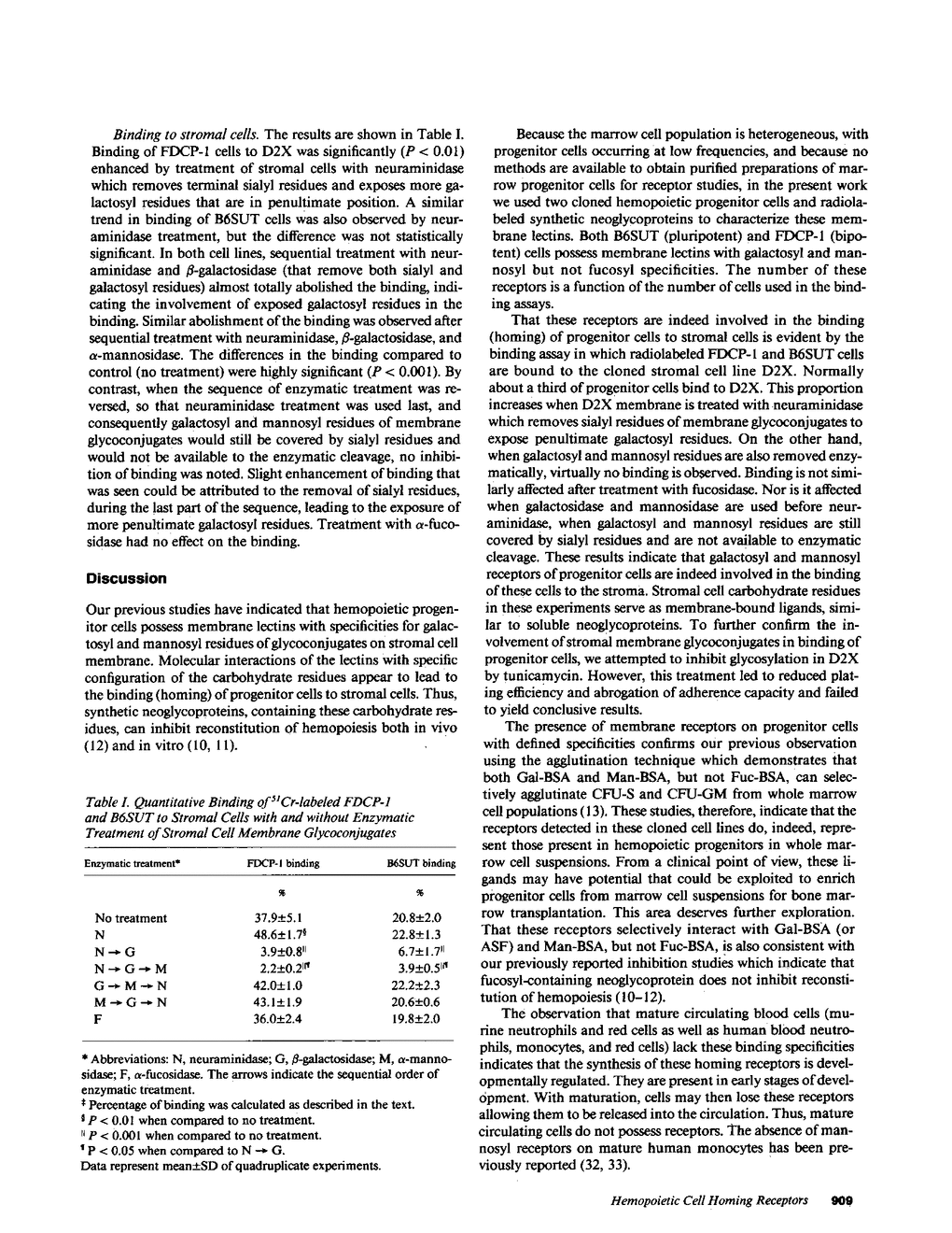 To characterize homing receptors that are responsible for the recognition and specific binding of hemopoietic progenitor cells to the stroma, we synthesized and 125I-labeled a number of neoglycoproteins. We used these neoglycoproteins as ligand to detect receptors on the membrane of two cloned murine hemopoietic progenitor cell lines, B6SUT and FDCP-1. Both cell lines demonstrated membrane receptors with galactosyl and mannosyl, but not fucosyl, specificities. B6SUT galactosyl receptors showed a single receptor population with a Kd of about 2.3 X 10(-7) M and 10(6) receptors per cell. Mannosyl receptors demonstrated two components with high and low affinities respectively with Kd of about 2.5 X 10(-8) M and 1.0 X 10(-7) M, and respectively about 7.4 X 10(5) and 3.7 X 10(5) receptors per cell. Comparable data were also obtained for FDCP-1. Displacement experiments indicated that radioactive ligands bound to receptors could be increasingly displaced by homologous cold ligand giving typical sigmoid-shaped curves. Cold mannosyl probe could also displace radioactive galactosyl probe in a similar manner, but cold galactosyl probe displaced radioactive mannosyl ligand with a curve demonstrating two phases, further suggesting two receptor components for the mannosyl ligand. Mature murine neutrophils and red cells as well as human neutrophils, monocytes, and red cells showed no receptors. The functional significance of these receptors in binding to stromal cells was demonstrated by quantitation of the binding of 51Cr-labeled progenitor cells to the cloned stromal cell line, D2X, before and after enzymatic removal of various carbohydrate residues of membrane glycoconjugates. Enzymatic removal of galactosyl and mannosyl, but not fucosyl, residues almost totally eliminated the binding. The findings strongly suggest that these homing receptors are present on the surface of early hemopoietic progenitor cells. With maturation the cells lose their receptors, so that mature cells can be released into the blood stream.