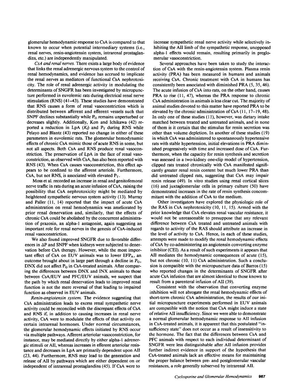 We evaluated the effects of chronic cyclosporine (CsA) administration on the determinants of nephron filtration rate (SNGFR) using micropuncture techniques (mp) in male Munich-Wistar rats. Animals received CsA (30 mg/kg SQ) in olive oil daily for 8 d before mp. Controls (PFC) were pair fed. SNGFR, glomerular capillary hydrostatic pressure gradient (delta P), nephron plasma flow (SNPF), plasma protein oncotic pressure (pi A), and glomerular ultrafiltration coefficient (LpA) were quantitated in each experiment. CsA was associated with a lower SNGFR due to decreases in SNPF and a major reduction in delta P but no decrease in LpA. Plasma volume expansion (PVE) caused SNGFR, delta P, and SNPF to increase in both CsA and PFC without eliminating the differences between CsA and PFC. CsA/PVE rats responded normally to angiotensin II (AII) infusion indicating that the low delta P associated with CsA is not due to unresponsiveness to AII. Prior renal denervation caused SNGFR and SNPF to increase in CsA-treated animals but failed to alter the reduction in glomerular capillary pressure after CsA or to eliminate the glomerular hemodynamic differences between treated animals and pair-fed controls. This constellation of glomerular hemodynamic abnormalities suggests that the renal effect of short-term chronic CsA administration is mediated primarily by a reduction in the afferent effective filtration pressure resulting from an imbalance between pre- and postglomerular vascular resistances.