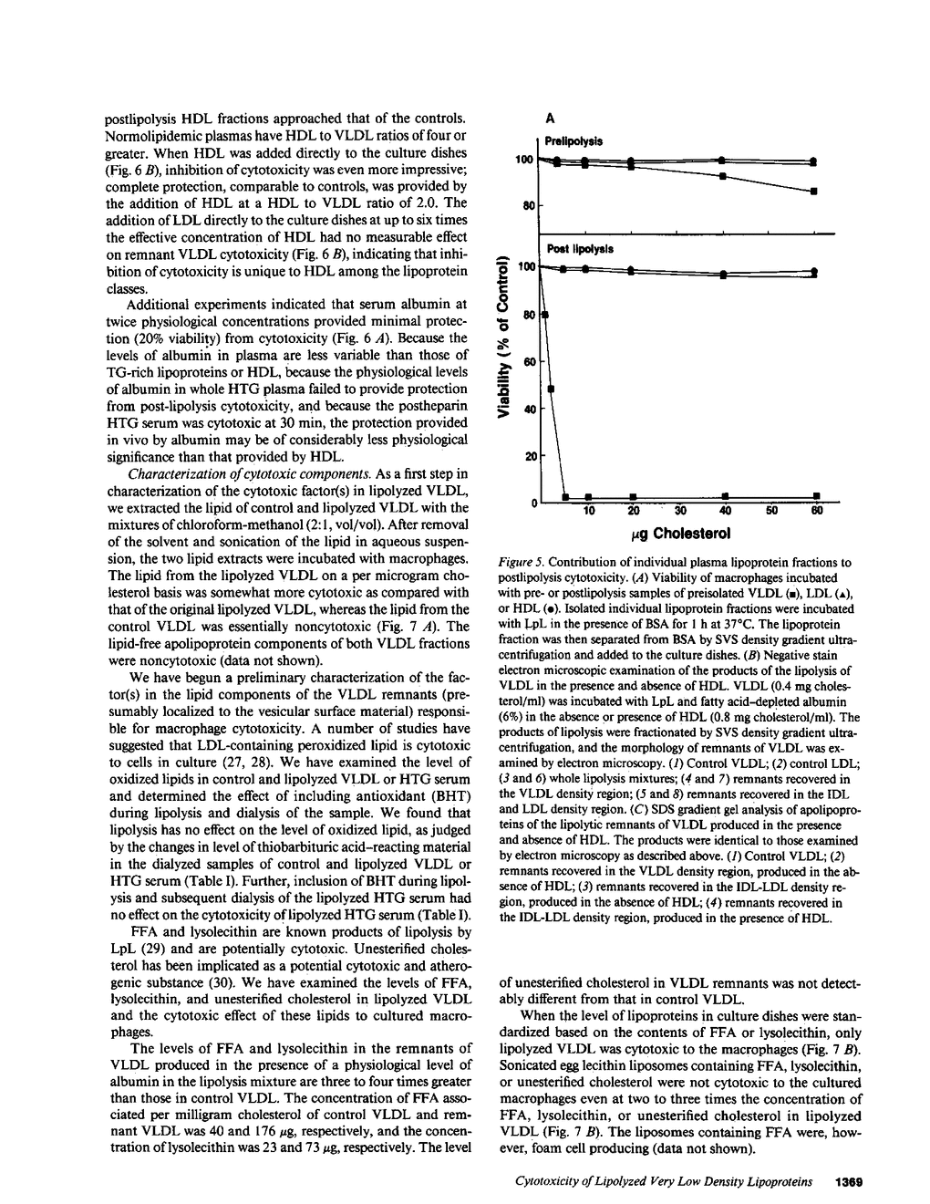 Hypertriglyceridemic (HTG) serum, lipolyzed in vitro by purified bovine milk lipoprotein lipase, was found to be cytotoxic to cultured macrophages. Surviving macrophages contained numerous lipid inclusions similar to those found in foam cells. Individual lipoprotein fractions isolated from the lipolyzed HTG serum, including HDL, were also cytotoxic. Lipolysis of isolated lipoprotein fractions (either HTG or normal) allowed localization of cytotoxicity to postlipolysis remnant VLDL and chylomicron particles. The presence of a critical concentration of HDL in either the lipolysis mixture or the culture dishes inhibited the cytotoxicity. Below this critical concentration HDL itself became cytotoxic, producing lipid inclusions in surviving macrophages. The lipid fraction of the cytotoxic remnants contained the cytotoxic factor(s); neither FFA nor lysolecithin alone could account for this cytotoxicity. Postprandial lipemic sera from subjects with a brisk chylomicron response, when lipolyzed in vitro, were cytotoxic to cultured macrophages; neither fasted sera from these subjects, nor postprandial sera from normolipidemic subjects with a normal chylomicron response, were cytotoxic. Postheparin (in vivo lipolyzed) serum and its isolated lipoprotein fractions obtained 30 min after heparin injection in subjects with HTG were shown to be cytotoxic to macrophages; by 60 min most of the cytotoxicity had disappeared. The postprandial and postheparin observations support an in vivo significance for remnant-associated cytotoxicity. We hypothesize that cytotoxic remnants of lipolyzed VLDL and chylomicrons may be one of the major atherogenic lipoproteins. Further, we suggest that inhibition of the cytotoxicity of these remnants may be one important way that HDL prevents atherosclerosis.