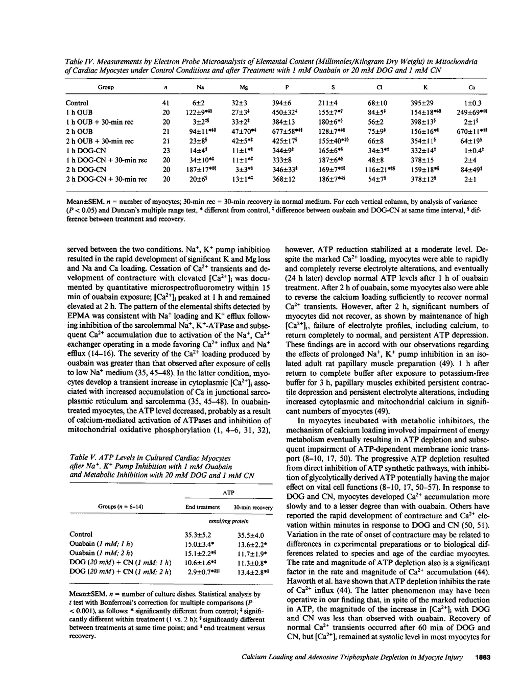 This study tested the hypothesis that the initiating mechanism is a major determinant of the response to calcium (Ca) accumulation in myocardium. Cultured neonatal rat ventriculocytes were exposed to Na+, K+ pump inhibition with 1 mM ouabain and metabolic inhibition with 20 mM 2-deoxy-D-glucose and 1 mM cyanide (DOG-CN) for up to 2 h. Microspectrofluorometry of myocytes loaded with fura-2 showed that ouabain resulted in a relatively rapid increase in [Ca2+]i up to 2-3 microM (two to threefold above peak systolic level) and that DOG-CN produced an initial decrease and then a relatively slow increase in [Ca2+]i up to peak systolic level. Electron probe x-ray microanalysis (EPMA) showed prominent increases in Na and Ca and decreases in K and Mg in cytoplasm and mitochondria with both interventions, although the increases in Ca were greater with ouabain than DOG-CN. ATP was reduced by 58% after 1 and 2 h of ouabain and by 70 and 90% after 1 and 2 h of DOG-CN, respectively. Thus, ouabain produced greater calcium accumulation and less ATP reduction than DOG-CN. Upon return to normal medium for 30 min, myocytes showed recovery of most electrolyte alterations and resumption of normal Ca2+ transients after 1 h exposure to either ouabain or DOG-CN; however, recovery was less after 2 h of either treatment, with elevated [Ca2+]i maintained in many myocytes. We conclude that the severity of myocyte injury is influenced by the magnitude and duration of both ATP reduction and calcium accumulation.