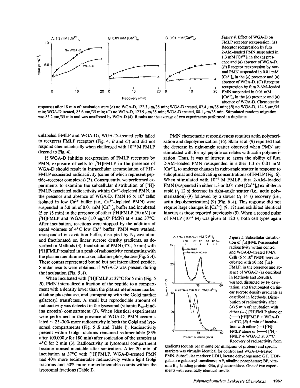 We examined the role of intracellular and extracellular calcium on the ability of human polymorphonuclear leukocytes to migrate chemotactically and reexpress (or recycle) formyl peptide receptors when challenged with the synthetic chemotactic peptide, N-formyl-methionyl-leucyl-phenylalanine (FMLP). Extracellular calcium was not required for either optimal chemotactic responses or receptor reexpression. Depletion and chelation of intracellular calcium resulted in significant diminution in the ability of polymorphonuclear leukocytes to release the specific granule constituents lactoferrin and vitamin B12-binding protein during the process of chemotaxis, but had no effect on the capability of these cells to respond chemotactically. Similarly, chelation of intracellular calcium did not affect the ability of these cells to reexpress a population of formyl peptide receptors. Inhibition of receptor reexpression, by a nonagglutinating derivative of wheat-germ agglutinin, was associated with inhibition of chemotactic responses to FMLP. Thus, it appears that large changes in cytosolic free calcium are not necessary for formyl peptide-induced polymorphonuclear leukocyte chemotaxis. In contrast, continuous reexpression (or recycling) of formyl peptide receptors is required for polymorphonuclear leukocyte chemotactic responses to FMLP, a process that appears to be independent from specific granule fusion with plasma membrane.