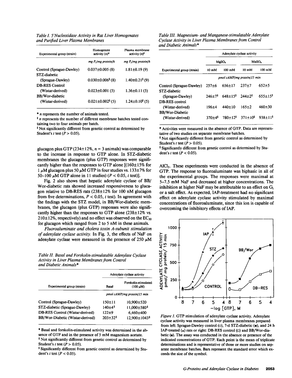 Adenylate cyclase in liver plasma membranes from streptozotocin-diabetic (STZ) or BB/Wor spontaneously diabetic rats showed increased responsiveness to GTP, glucagon, fluoroaluminate, and cholera toxin. Basal or forskolin-stimulated activity was unchanged in STZ rats, but increased in BB/Wor rats. No change in the alpha-subunit of Gi (alpha i) was observed in STZ or BB/Wor rats using pertussis toxin-stimulated [32P]ADP-ribosylation. Immunodetection using antibodies against the COOH-terminal decapeptides of alpha T and alpha i-3 showed no change in alpha i in STZ rats and a slight decrease in BB/Wor rats. Angiotensin II inhibition of hepatic adenylate cyclase was not altered in either diabetic rat. In both models of diabetes, Gs alpha-subunits were increased as measured by cholera toxin-stimulated [32P]-ADP-ribosylation of 43-47.5-kD peptides, reconstitution with membranes from S49 cyc- cells or immunoreactivity using antibodies against the COOH-terminal decapeptide of alpha s. These data indicate that STZ-diabetes increases hepatic Gs but does not change Gi or adenylate cyclase catalytic activity. In contrast, BB/Wor rats show increased hepatic Gs and adenylate cyclase. These changes could explain the increase in hepatic cAMP and related dysfunctions observed in diabetes.