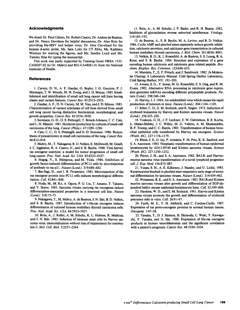 Human small cell lung cancers (SCLC) and cell lines derived therefrom are phenotypically heterogeneous concerning neuroendocrine differentiation. Unlike most SCLC tumors and cell lines that express poorly differentiated neuroendocrine phenotypes, the SCLC cell line DMS 53 exhibits mature endocrine differentiation features, including unusually high expression of the gene for the peptide hormone, calcitonin (CT). We now report that introduction of the viral Harvey ras (v-rasH) oncogene into DMS 53 cells via retroviral infection, with resultant constitutive expression, results in increased features of neuroendocrine differentiation. 7-10 d after infection the cells demonstrated altered morphology, increased CT secretion, increased CT gene expression, markedly diminished cellular proliferation, and nearly abolished methylcellulose cloning efficiency. This response of DMS 53 cells to v-rasH is unlike the tumor progression effects we have previously observed in other SCLC lines. Significantly, the differentiation response that follows expression of the virally introduced v-rasH oncogene in DMS 53 cells is similar to that of neoplastic neuroendocrine cell lines derived from adrenal pheochromocytes and thyroid C cells. The effects of constitutive v-rasH expression in DMS 53 SCLC cells and other neuroendocrine cell lines suggest an important role for rasH or related genes in neuroendocrine differentiation.