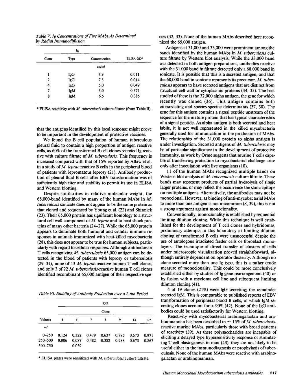 Pleural tuberculosis constitutes a human model of local protective immunity to mycobacterial infection as the disease is usually self-limited and recurrent pleurisy is rare. To identify potentially protective antigens of Mycobacterium tuberculosis, 37 human pleural fluid B cell clones were established using EBV and their supernatants assayed by ELISA and Western blot for antibody reactivity with M. tuberculosis sonicate and culture filtrate. One antibody identified 29,000, 31,000, and 33,000 bands in culture filtrate, and 31,000, 33,000, and 47,000 bands in sonicate; its species reactivity by ELISA was limited to M. tuberculosis. Eight antibodies identified a 31,000 band in culture filtrate and a 68,000 band in M. tuberculosis sonicate, suggesting recognition of a secreted antigen. The species crossreactivity of these eight antibodies extended to M. avium. Six antibodies identified multiple bands and had crossreactivity that included M. avium and M. kansasii. There was no reactivity with recombinant M. tuberculosis 65,000 antigen. Tuberculous pleurisy may prove useful in the identification of potentially protective mycobacterial antigens, particularly those secreted during active infection, and thus accessible to the human immune response.