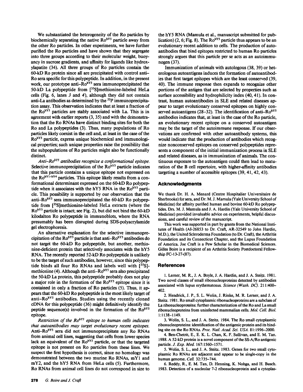 Anti-Ro autoantibodies found in sera from patients with systemic lupus erythematosus and related diseases precipitate four RNAs (hY1-hY5) from human cell extracts. We identified two patient sera that selectively immunoprecipitated from such extracts the Ro particle containing the hY5 RNA (RohY5 particle). Using cell fractions either enriched in or depleted of RohY5 particles, we have shown that these sera contain autoantibodies that target an antigenic determinant on the 60-kD Ro polypeptide that is expressed only on RohY5 particles and is absent on the Ro particles containing the hY1-hY4 RNAs (RohY1-hY4 particles). In a competitive inhibition assay using a cell fraction enriched in RohY1-hY4 particles but depleted of RohY5 particles, four of six control anti-Ro sera were also shown to contain antibodies reactive with the epitope specific for the RohY5 particle. Thus anti-RohY5 antibodies frequently occur in tandem with anti-Ro antibodies, but are not detected unless inhibition assays are performed. Finally, anti-RohY5 specific sera do not immunoprecipitate any Ro particles from various nonhuman cell lines. In contrast to other autoantibodies in systemic lupus and related diseases that bind conserved regions on conserved polypeptides, this observation suggests that a portion of the anti-Ro response targets a nonconserved epitope on a conserved autoantigen.