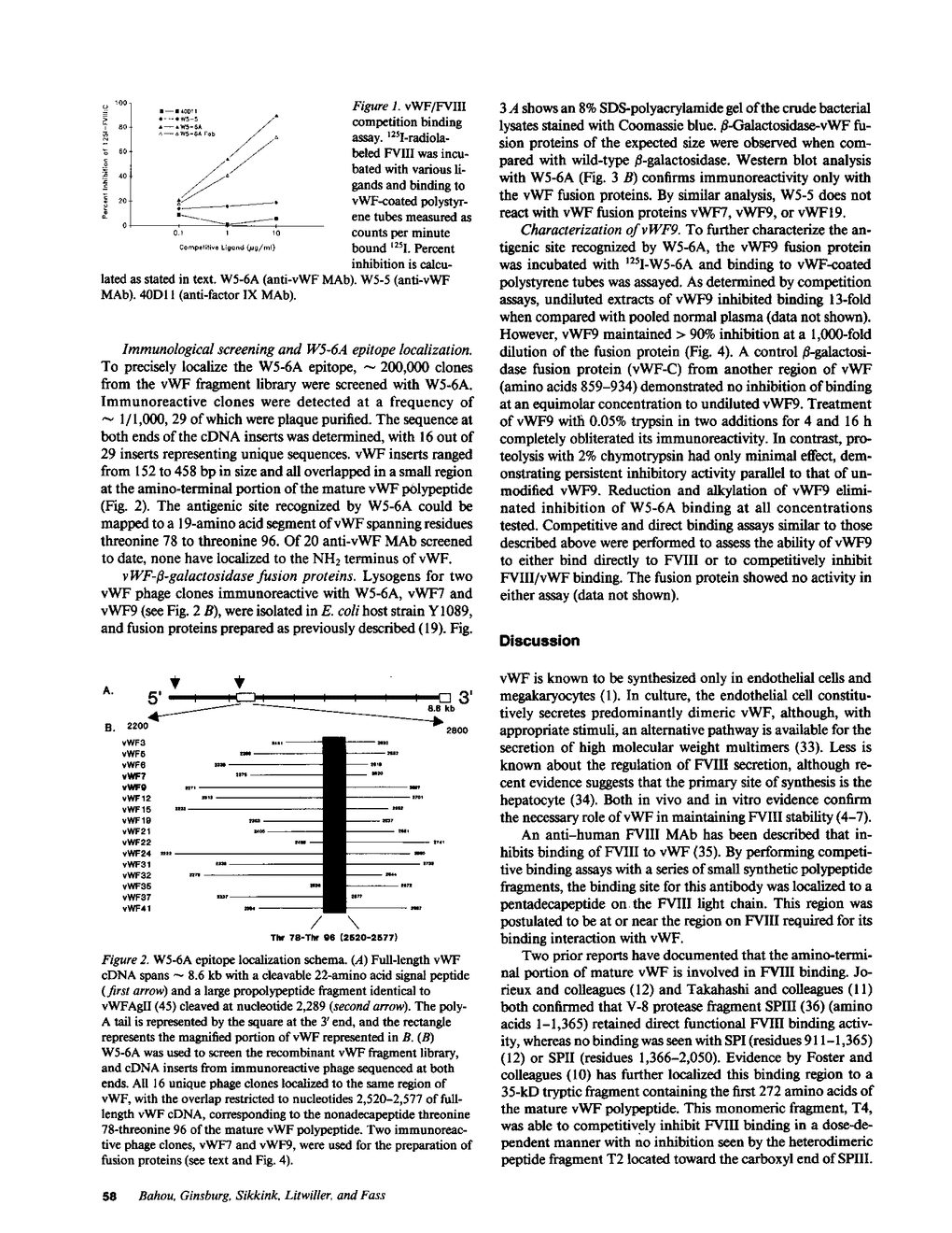 vWF is a multimeric glycoprotein that serves as the major carrier in plasma of Factor VIII (FVIII). We have used an anti-human vWF MAb W5-6A to investigate the FVIII binding site on vWF. W5-6A inhibited FVIII binding to vWF-coated polystyrene tubes in a concentration-dependent manner with 90% inhibition of FVIII binding at a concentration of 10 micrograms/ml. The W5-6A epitope was identified by screening a vWF fragment library using the bacteriophage expression vector lambda gt11. DNA sequence analysis of 29 immunoreactive phage clones localized the W5-6A epitope to a nonadecapeptide spanning amino acid residues threonine 78 to threonine 96 at the amino-terminus of the mature vWF polypeptide. Purified beta-galactosidase/vWF fusion protein from one of these clones, vWF9, was incubated with radiolabeled W5-6A and caused near complete inhibition of W5-6A binding to vWF. Inhibitory activity was lost after vWF9 trypsinization or reduction and alkylation. These data indicate that (a) the antigenic determinant recognized by W5-6A localizes to a nonadecapeptide at the NH2 terminus of the mature vWF polypeptide, (b) disulfide bonds within vWF9 may be necessary to maintain the structure required for immunoreactivity with W5-6A, and (c) W5-6A recognizes an immunogenic region on vWF that may be at (or near) the major FVIII binding domain.