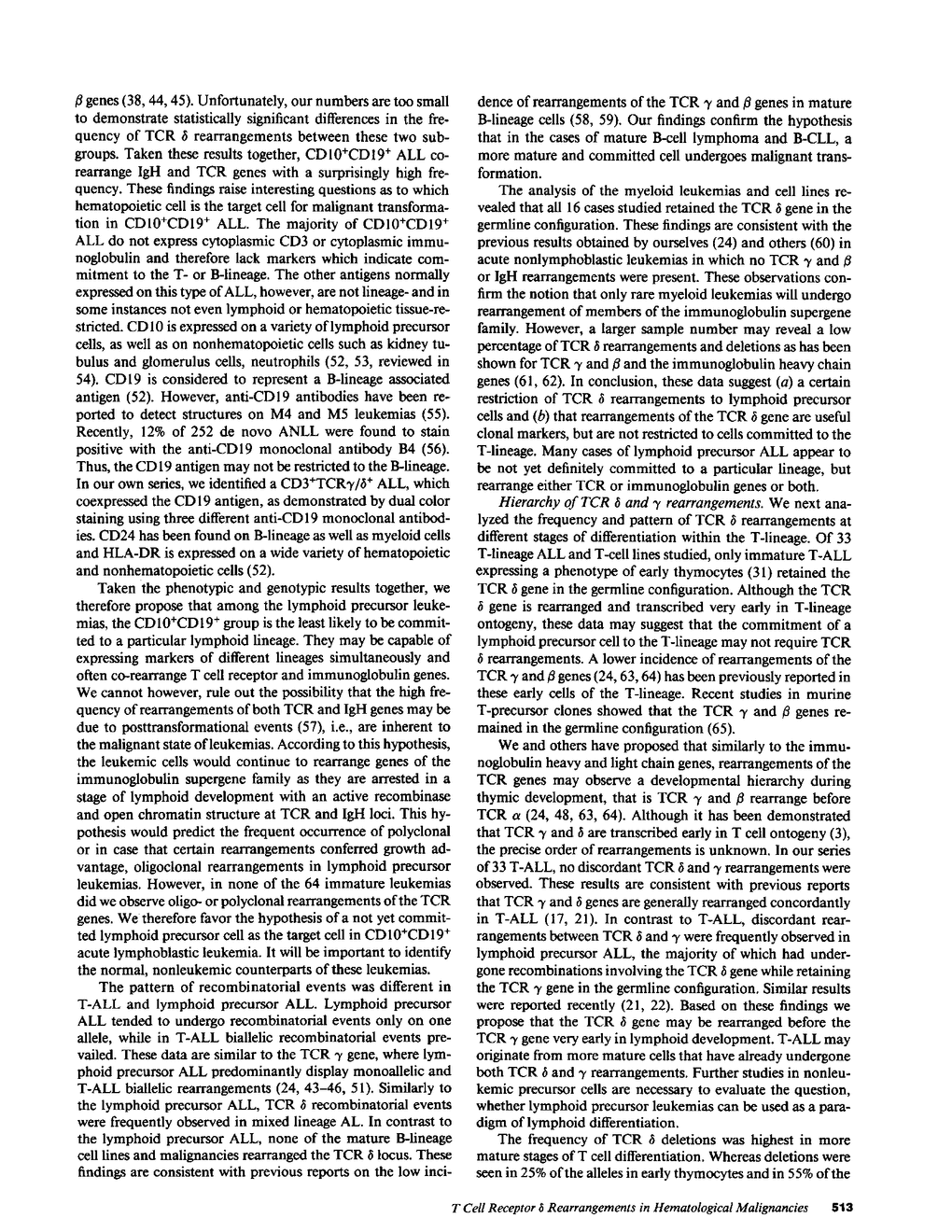 We have studied recombinatorial events of the T cell receptor delta and gamma chain genes in hematopoietic malignancies and related these to normal stages of lymphoid differentiation. T cell receptor delta gene recombinatorial events were found in 91% of acute T cell lymphoblastic leukemia, 68% of non-T, non-B lymphoid precursor acute lymphoblastic leukemia (ALL) and 80% of mixed lineage acute leukemias. Mature B-lineage leukemias and acute nonlymphocytic leukemias retained the T-cell receptor delta gene in the germline configuration. The incidence of T cell receptor gamma and delta was particularly high in CD10+CD19+ non-T, non-B lymphoid precursor ALL. In lymphoid precursor ALL, T cell receptor delta was frequently rearranged while T cell receptor gamma was in the germline configuration. This suggests that TCR delta rearrangements may precede TCR gamma rearrangements in lymphoid ontogeny. In T-ALL, only concordant T cell receptor delta and gamma rearrangements were observed. Several distinct rearrangements were defined using a panel of restriction enzymes. Most of the rearrangements observed in T-ALL represented joining events of J delta 1 to upstream regions. In contrast, the majority of rearrangements in lymphoid precursor ALL most likely represented D-D or V-D rearrangements, which have been found to be early recombinatorial events of the TCR delta locus. We next analyzed TCR delta rearrangements in five CD3+TCR gamma/delta+ ALL and cell lines. One T-ALL, which demonstrated a different staining pattern with monoclonal antibodies against the products of the TCR gamma/delta genes than the PEER cell line, rearranges J delta 1 to a currently unidentified variable region.