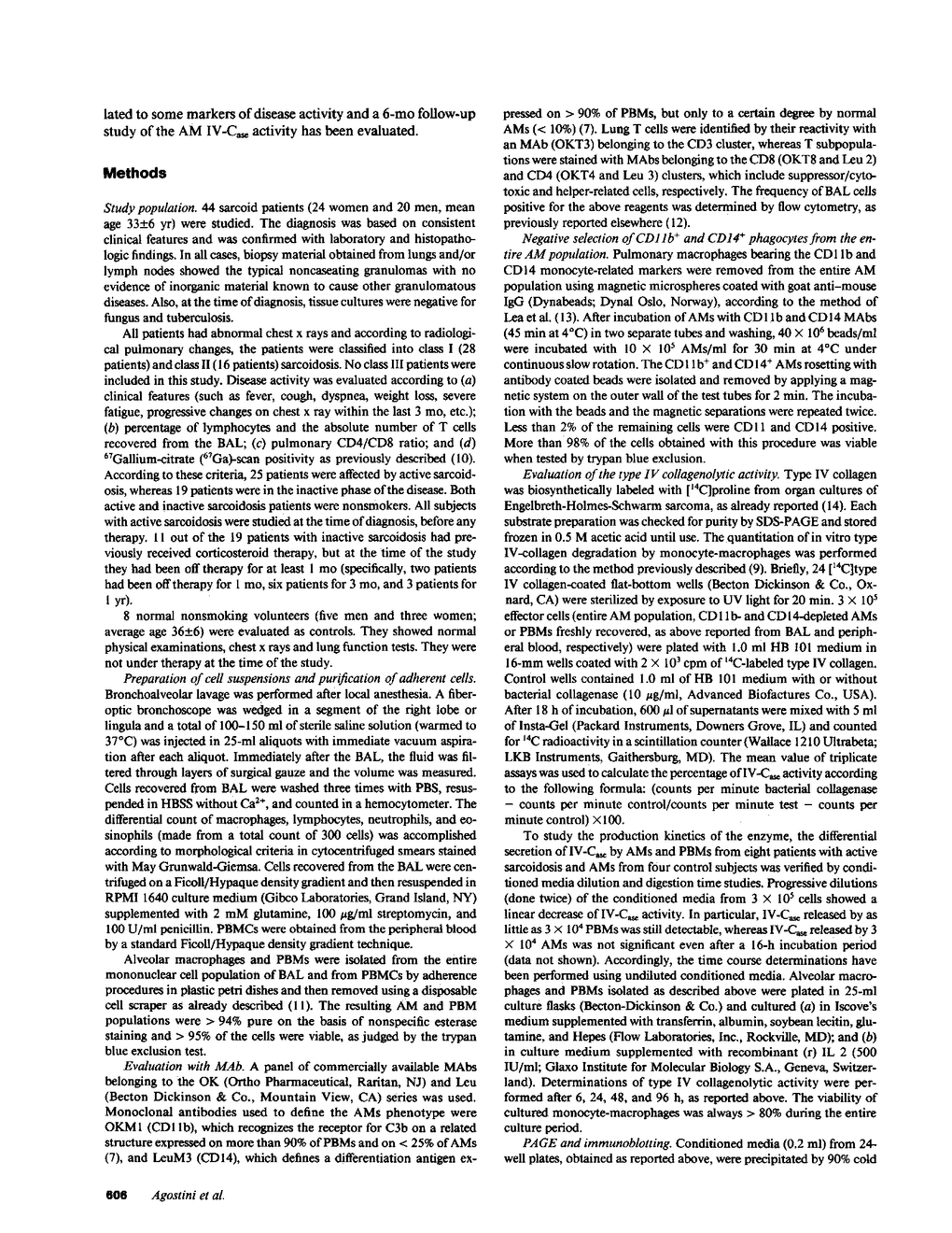 Alveolar macrophages (AMs) recovered from the bronchoalveolar lavage (BAL) of 44 patients with sarcoidosis were evaluated for their ability to release type IV collagenolytic metalloproteinase (IV-Case). This enzyme, which is produced by peripheral blood monocytes (PBMs) but not by tissue macrophages, degrades type IV collagen, the major structural component of vessel wall basement membranes, and helps to promote the migration of PBMs from the blood compartment to peripheral tissues. Our results demonstrated that AMs from patients with active sarcoidosis released significantly increased levels of IV-Case with respect to patients with inactive disease and control subjects. After in vitro culture, sarcoid AMs secreted IV-Case during the first 24 h of collection; after that time, AMs progressively lost their ability to release IV-Case. Exposition of both sarcoid and normal AMs to recombinant IL 2 or gamma IFN did not influence their property to release IV-Case. The immunoblot analysis of IV-Case demonstrated complete identity between IV-Case released by AMs and the degradative enzyme obtained from PBMs. The increased property to release IV-Case was significantly related to the increase of the absolute number of AMs and, in particular, of AMs bearing two determinants that are usually expressed by most PBMs (CD11b and CD14). Selective depletion of CD11b+/CD14+ AMs from the entire macrophagic population was associated with the recovery of the IV-Case activity to normal values. A positive correlation was also found between the increase in the absolute number of lung T cells and the enhanced CD4/CD8 pulmonary ratio. A 6-mo follow-up study indicated a significant association between the positivity for the 67Gallium scan and the increased property of AMs to release IV-Case. Our data are consistent with the hypothesis that a IV-Case mediated influx of peripheral monocytes takes place in the lung of sarcoid patients. Furthermore, the correlation found between the IV-Case release and disease activity suggests that this assay could represent a useful tool in sarcoidosis disease staging.