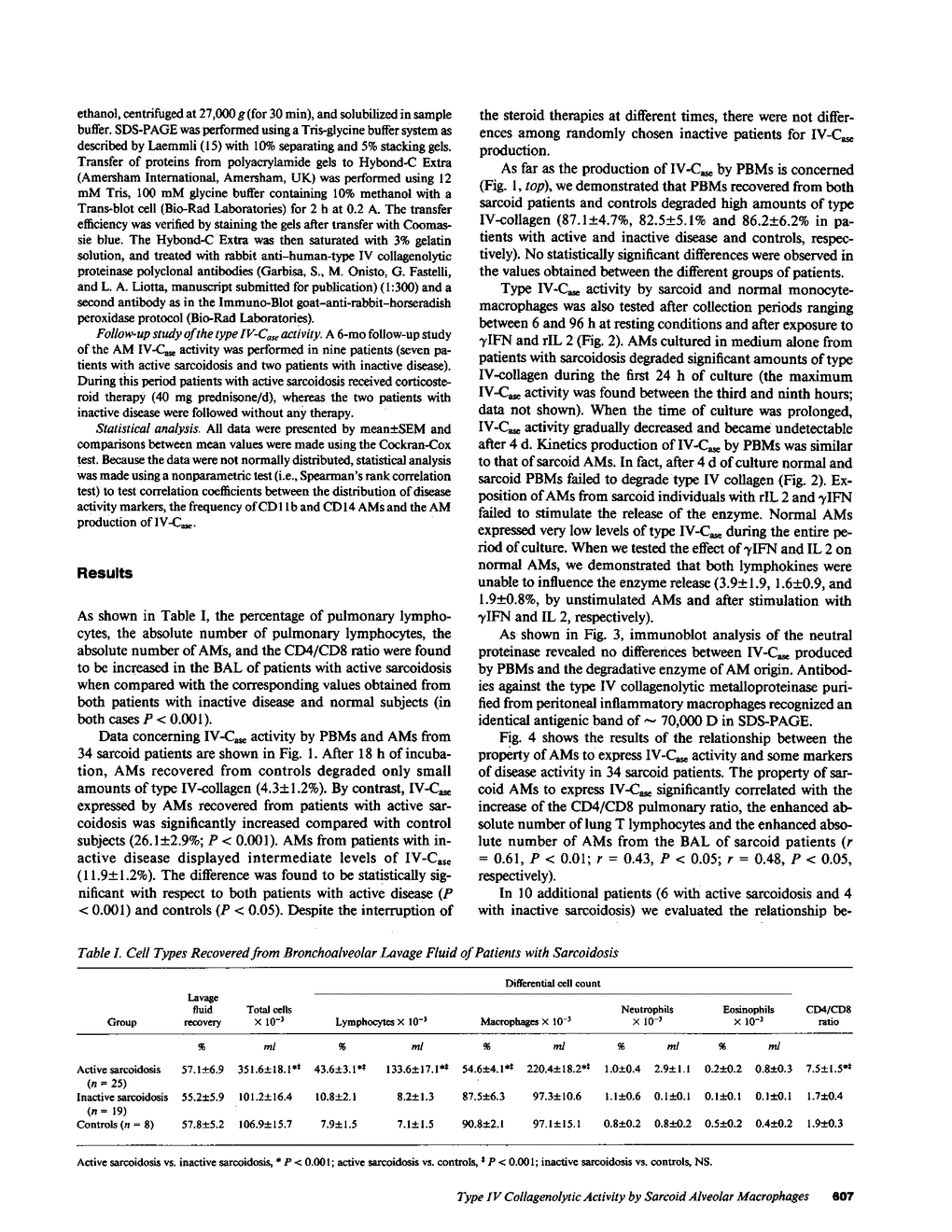 Alveolar macrophages (AMs) recovered from the bronchoalveolar lavage (BAL) of 44 patients with sarcoidosis were evaluated for their ability to release type IV collagenolytic metalloproteinase (IV-Case). This enzyme, which is produced by peripheral blood monocytes (PBMs) but not by tissue macrophages, degrades type IV collagen, the major structural component of vessel wall basement membranes, and helps to promote the migration of PBMs from the blood compartment to peripheral tissues. Our results demonstrated that AMs from patients with active sarcoidosis released significantly increased levels of IV-Case with respect to patients with inactive disease and control subjects. After in vitro culture, sarcoid AMs secreted IV-Case during the first 24 h of collection; after that time, AMs progressively lost their ability to release IV-Case. Exposition of both sarcoid and normal AMs to recombinant IL 2 or gamma IFN did not influence their property to release IV-Case. The immunoblot analysis of IV-Case demonstrated complete identity between IV-Case released by AMs and the degradative enzyme obtained from PBMs. The increased property to release IV-Case was significantly related to the increase of the absolute number of AMs and, in particular, of AMs bearing two determinants that are usually expressed by most PBMs (CD11b and CD14). Selective depletion of CD11b+/CD14+ AMs from the entire macrophagic population was associated with the recovery of the IV-Case activity to normal values. A positive correlation was also found between the increase in the absolute number of lung T cells and the enhanced CD4/CD8 pulmonary ratio. A 6-mo follow-up study indicated a significant association between the positivity for the 67Gallium scan and the increased property of AMs to release IV-Case. Our data are consistent with the hypothesis that a IV-Case mediated influx of peripheral monocytes takes place in the lung of sarcoid patients. Furthermore, the correlation found between the IV-Case release and disease activity suggests that this assay could represent a useful tool in sarcoidosis disease staging.