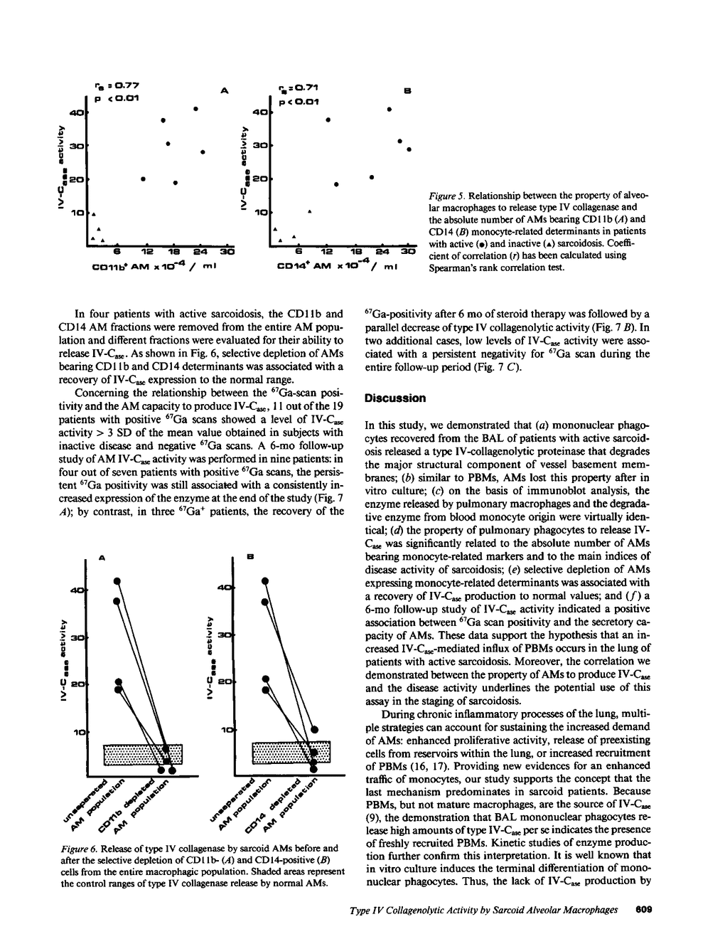 Alveolar macrophages (AMs) recovered from the bronchoalveolar lavage (BAL) of 44 patients with sarcoidosis were evaluated for their ability to release type IV collagenolytic metalloproteinase (IV-Case). This enzyme, which is produced by peripheral blood monocytes (PBMs) but not by tissue macrophages, degrades type IV collagen, the major structural component of vessel wall basement membranes, and helps to promote the migration of PBMs from the blood compartment to peripheral tissues. Our results demonstrated that AMs from patients with active sarcoidosis released significantly increased levels of IV-Case with respect to patients with inactive disease and control subjects. After in vitro culture, sarcoid AMs secreted IV-Case during the first 24 h of collection; after that time, AMs progressively lost their ability to release IV-Case. Exposition of both sarcoid and normal AMs to recombinant IL 2 or gamma IFN did not influence their property to release IV-Case. The immunoblot analysis of IV-Case demonstrated complete identity between IV-Case released by AMs and the degradative enzyme obtained from PBMs. The increased property to release IV-Case was significantly related to the increase of the absolute number of AMs and, in particular, of AMs bearing two determinants that are usually expressed by most PBMs (CD11b and CD14). Selective depletion of CD11b+/CD14+ AMs from the entire macrophagic population was associated with the recovery of the IV-Case activity to normal values. A positive correlation was also found between the increase in the absolute number of lung T cells and the enhanced CD4/CD8 pulmonary ratio. A 6-mo follow-up study indicated a significant association between the positivity for the 67Gallium scan and the increased property of AMs to release IV-Case. Our data are consistent with the hypothesis that a IV-Case mediated influx of peripheral monocytes takes place in the lung of sarcoid patients. Furthermore, the correlation found between the IV-Case release and disease activity suggests that this assay could represent a useful tool in sarcoidosis disease staging.