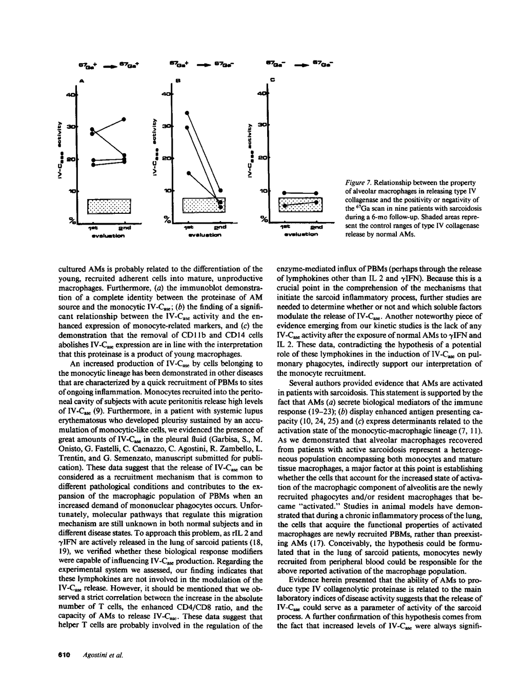 Alveolar macrophages (AMs) recovered from the bronchoalveolar lavage (BAL) of 44 patients with sarcoidosis were evaluated for their ability to release type IV collagenolytic metalloproteinase (IV-Case). This enzyme, which is produced by peripheral blood monocytes (PBMs) but not by tissue macrophages, degrades type IV collagen, the major structural component of vessel wall basement membranes, and helps to promote the migration of PBMs from the blood compartment to peripheral tissues. Our results demonstrated that AMs from patients with active sarcoidosis released significantly increased levels of IV-Case with respect to patients with inactive disease and control subjects. After in vitro culture, sarcoid AMs secreted IV-Case during the first 24 h of collection; after that time, AMs progressively lost their ability to release IV-Case. Exposition of both sarcoid and normal AMs to recombinant IL 2 or gamma IFN did not influence their property to release IV-Case. The immunoblot analysis of IV-Case demonstrated complete identity between IV-Case released by AMs and the degradative enzyme obtained from PBMs. The increased property to release IV-Case was significantly related to the increase of the absolute number of AMs and, in particular, of AMs bearing two determinants that are usually expressed by most PBMs (CD11b and CD14). Selective depletion of CD11b+/CD14+ AMs from the entire macrophagic population was associated with the recovery of the IV-Case activity to normal values. A positive correlation was also found between the increase in the absolute number of lung T cells and the enhanced CD4/CD8 pulmonary ratio. A 6-mo follow-up study indicated a significant association between the positivity for the 67Gallium scan and the increased property of AMs to release IV-Case. Our data are consistent with the hypothesis that a IV-Case mediated influx of peripheral monocytes takes place in the lung of sarcoid patients. Furthermore, the correlation found between the IV-Case release and disease activity suggests that this assay could represent a useful tool in sarcoidosis disease staging.